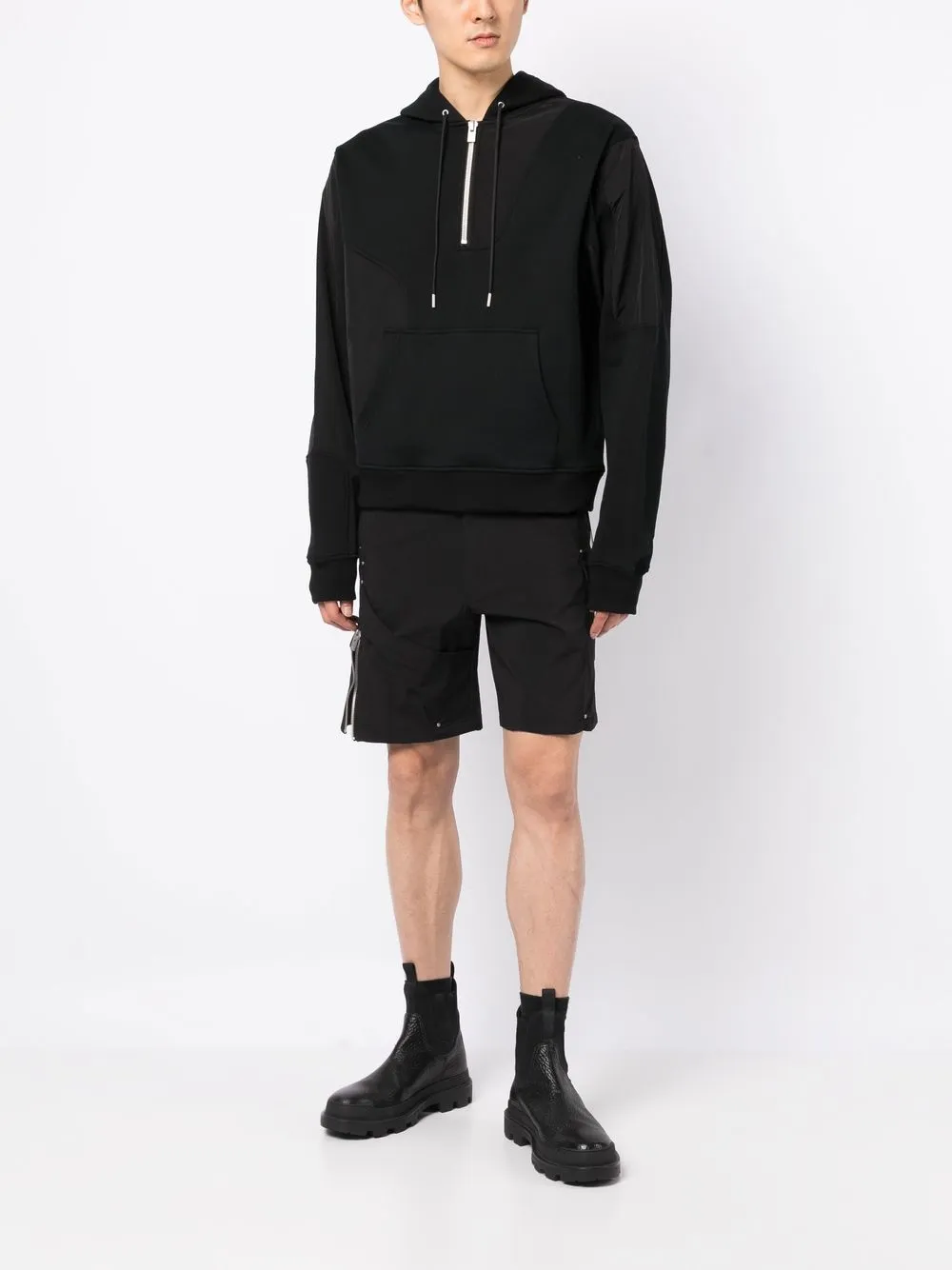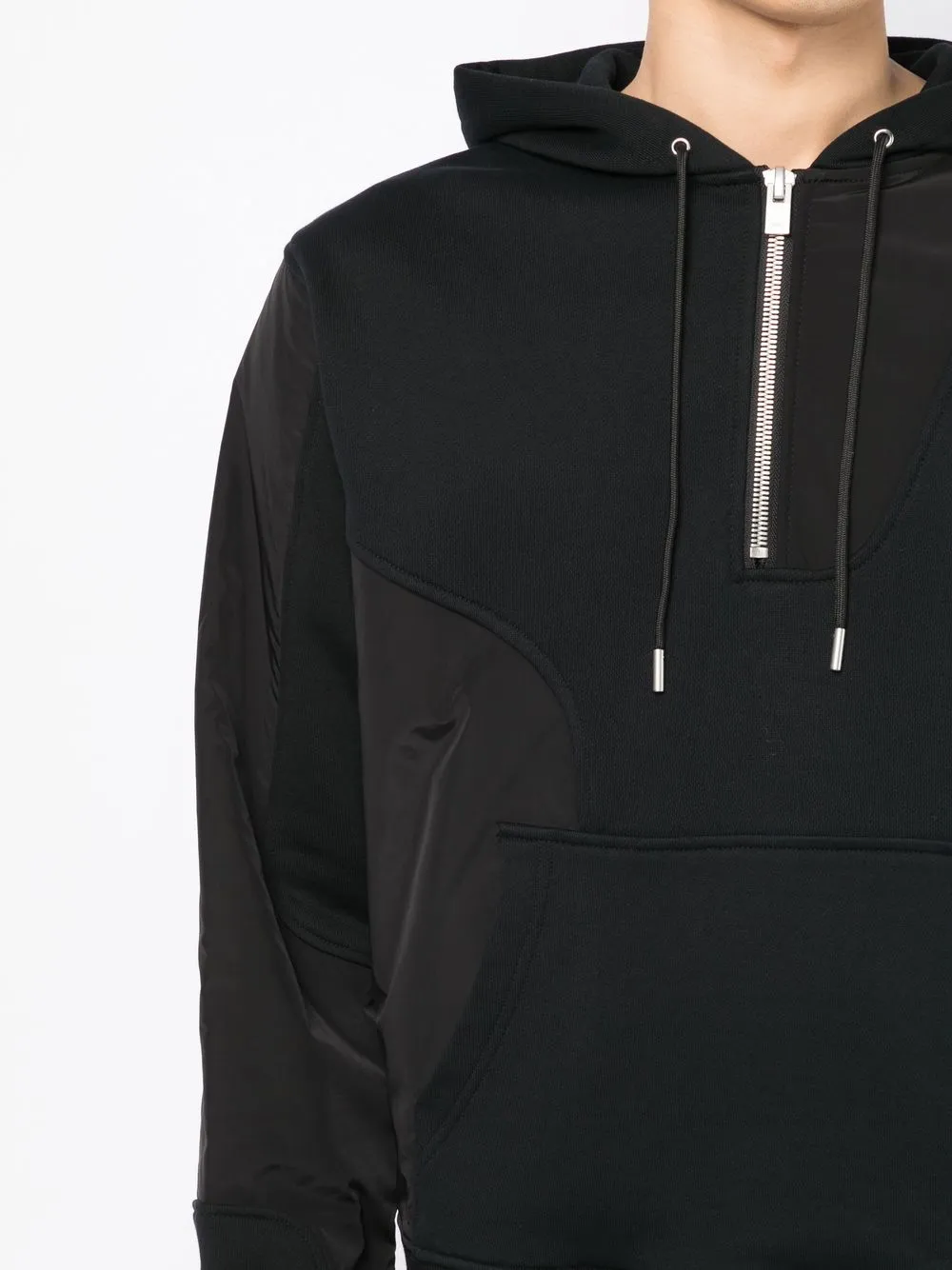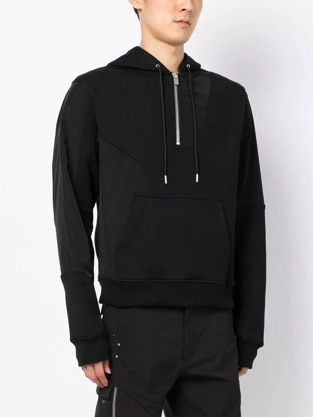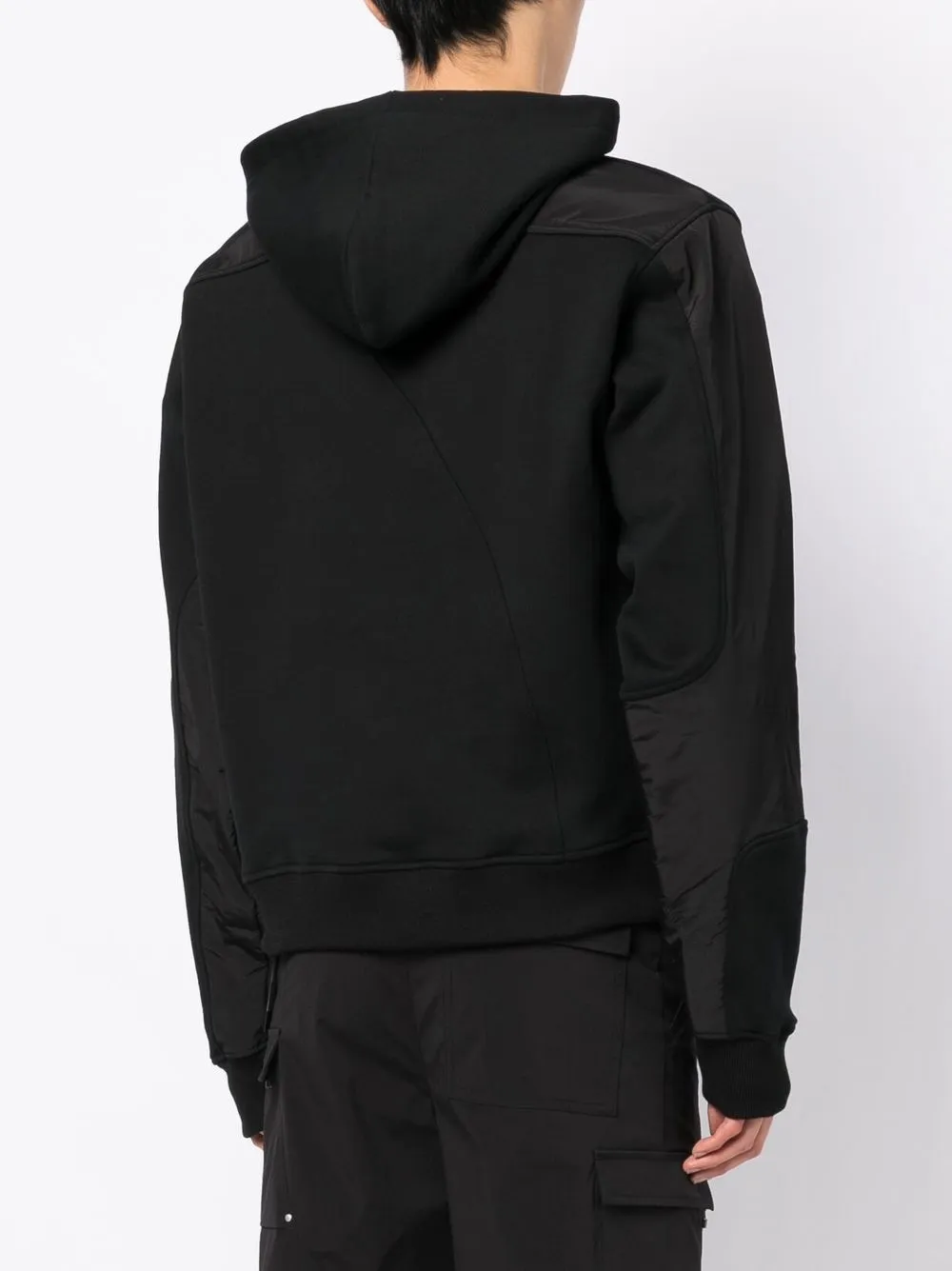 Черный, хлопок, ткань джерси, вставки, затягивающийся на шнурок капюшон, эластичные манжеты, эластичный подол, застежка на молнии спереди, длинные рукава и карман-муфта.