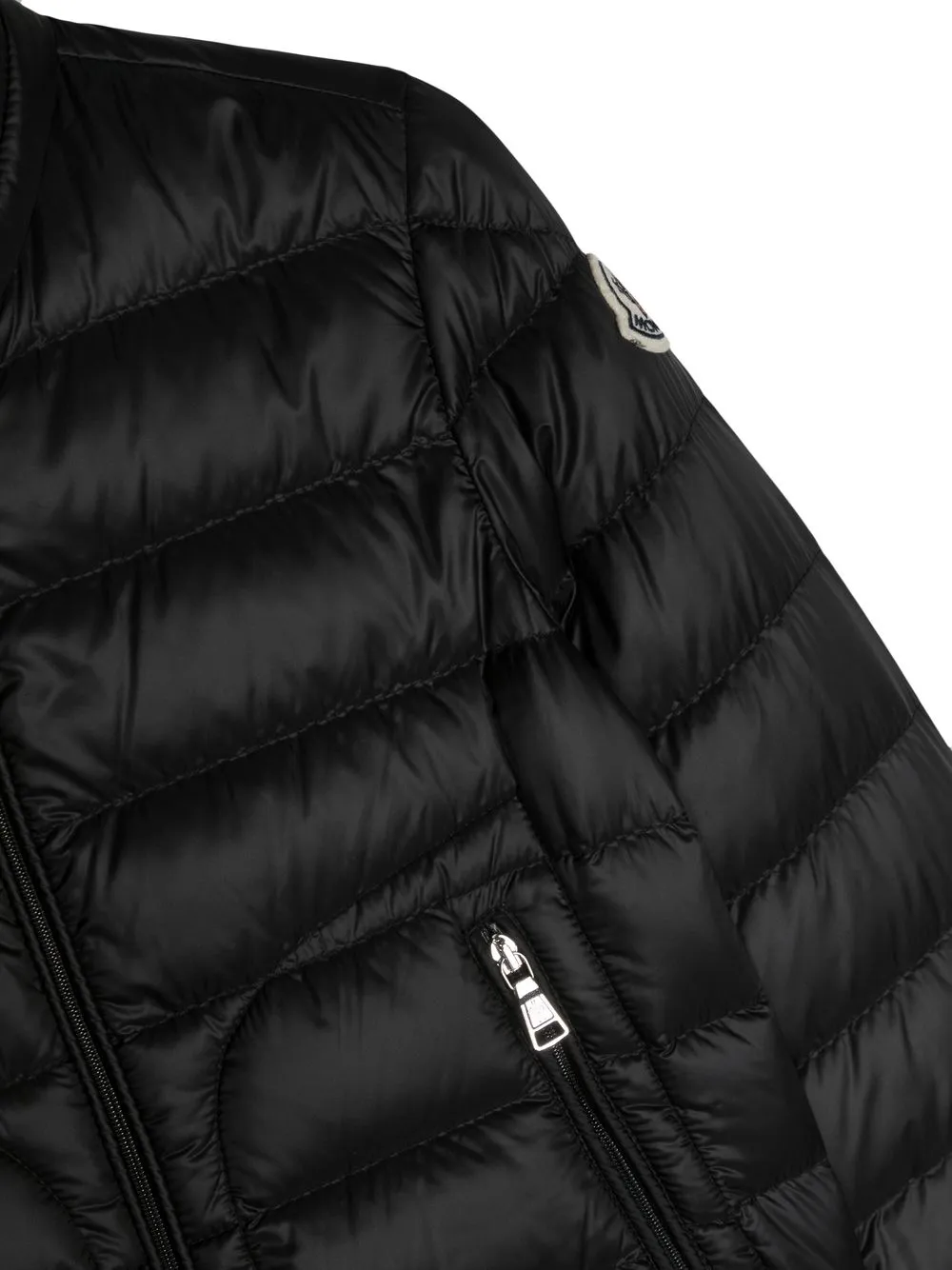 Черный, гусиный пух, дутый материал, нашивка с логотипом на рукаве, застежка на молнии спереди, длинные рукава, два прорезных кармана по бокам и прямой подол.