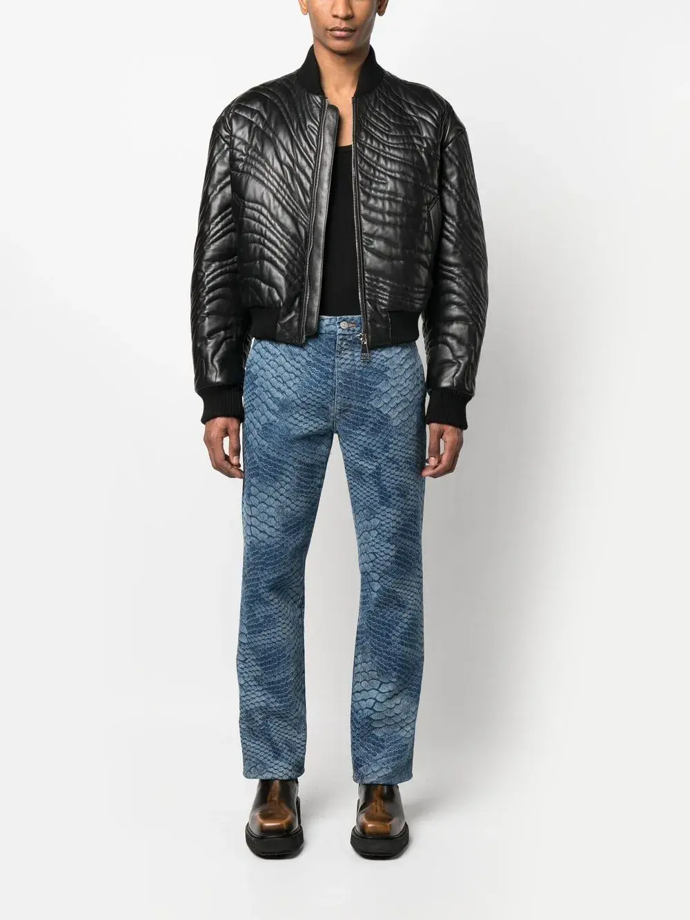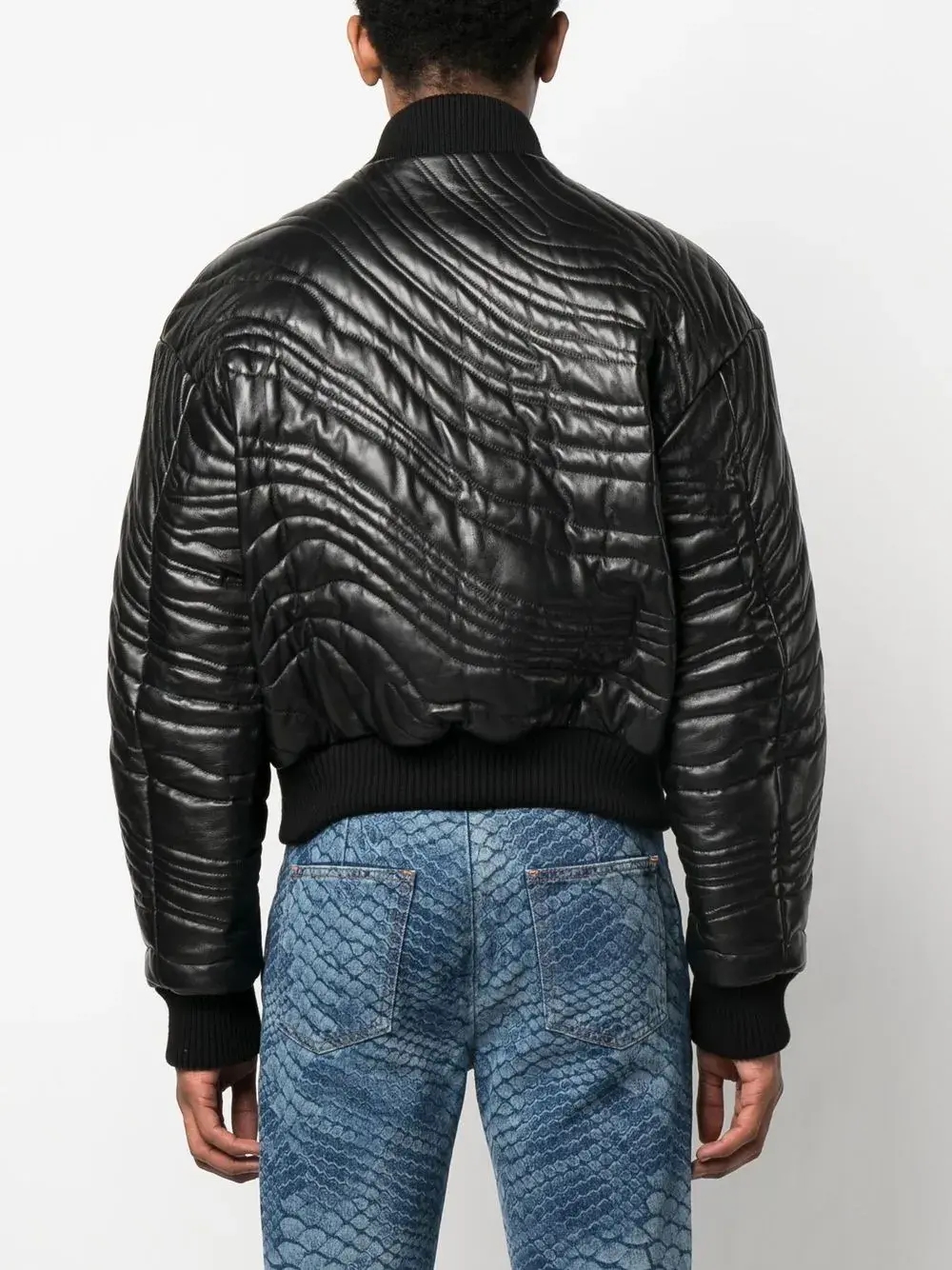 Черный, телячья кожа, стеганая отделка, воротник-стойка в рубчик, застежка на молнии спереди, длинные рукава и два боковых кармана с листочкой.
