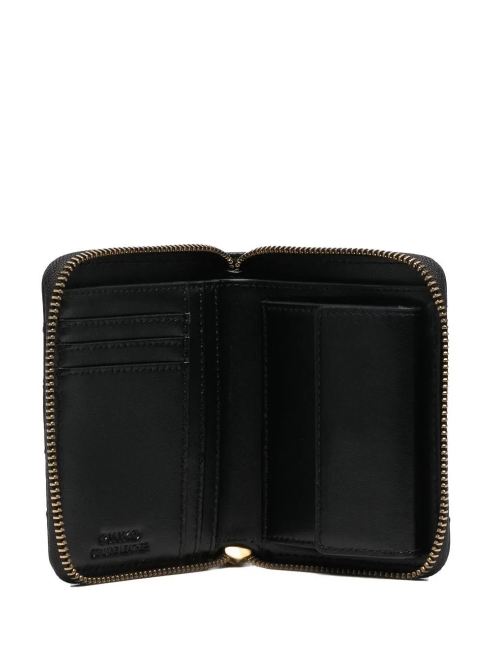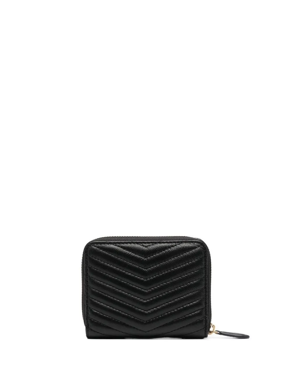 Черный, телячья кожа, золотистый металлический логотип, стеганая модель, круговая молния, основное отделение и отделения для карт.