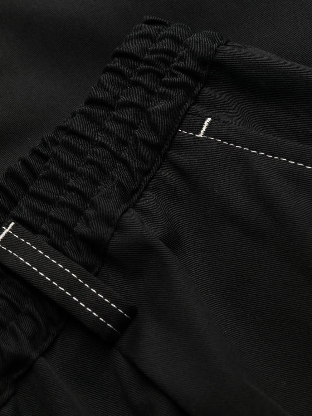 Черный, хлопок, контрастная строчка, эластичный пояс, петли для ремня, два прорезных кармана по бокам, прорезной карман на пуговице сзади и прямой крой.