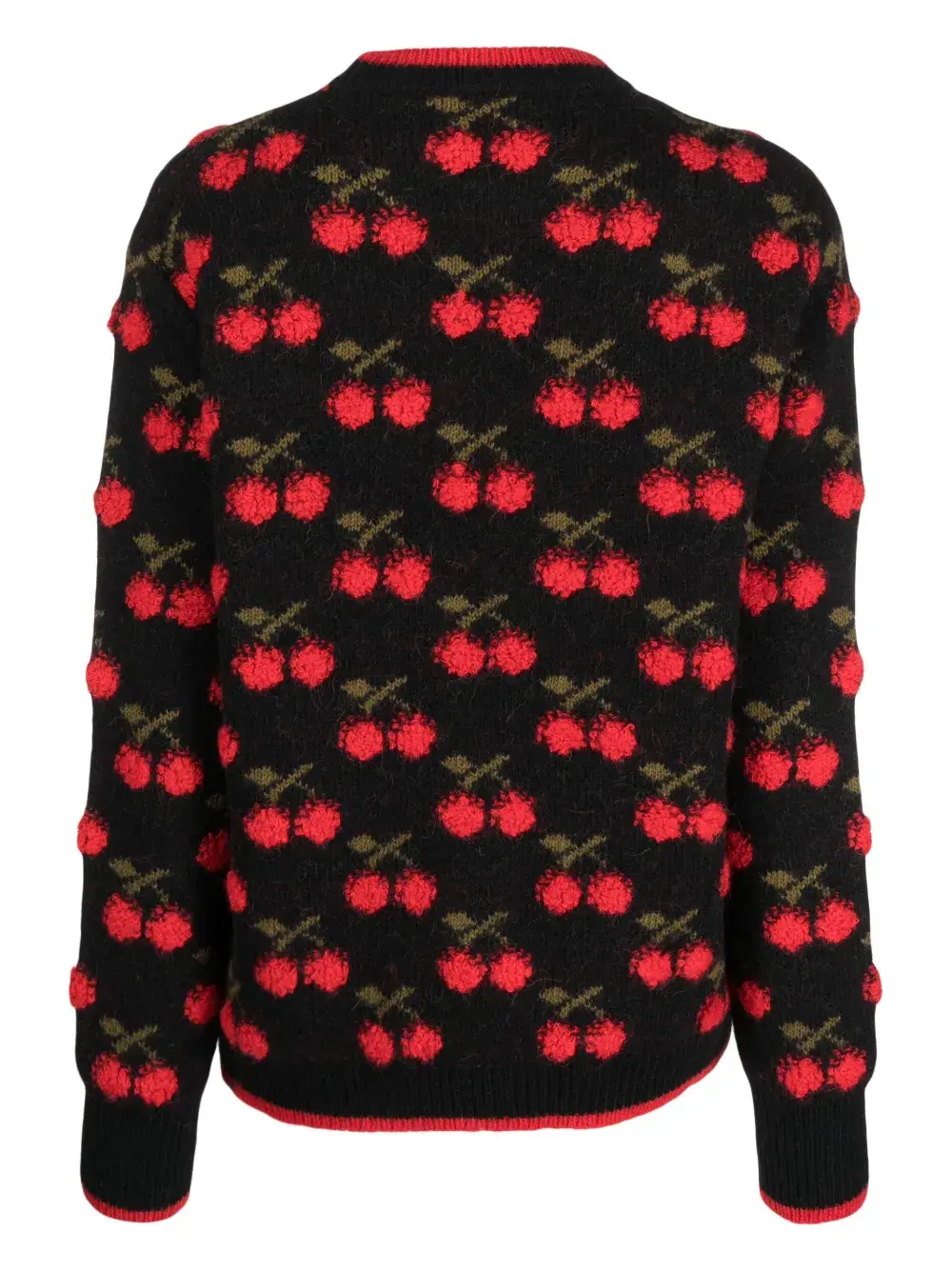 Черный/красный, трикотажный материал, принт с изображением фруктов, контрастная отделка, круглый вырез, длинные рукава и прямой подол.