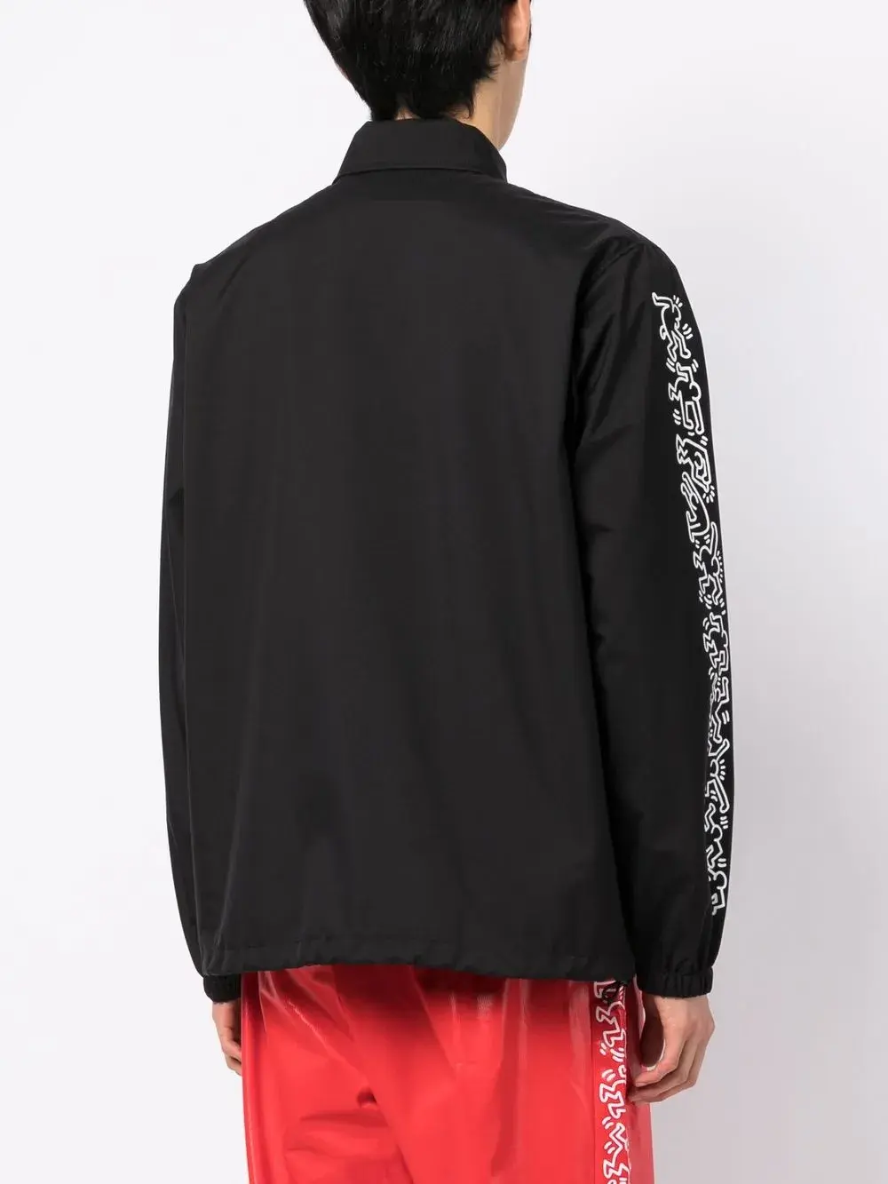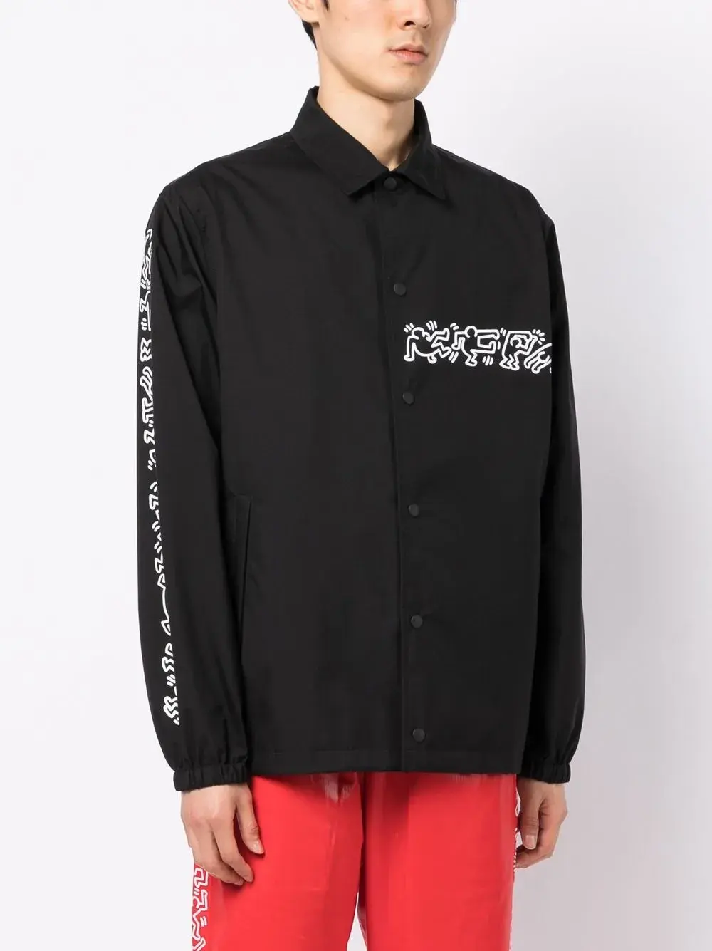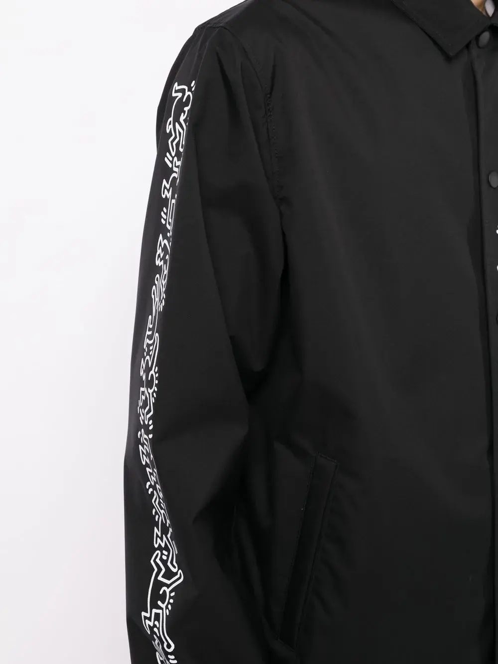 Черный/белый, классический воротник, застежка на кнопках, эластичные манжеты, два прорезных кармана спереди, прямой подол, рукава с графичным принтом и принт на груди.