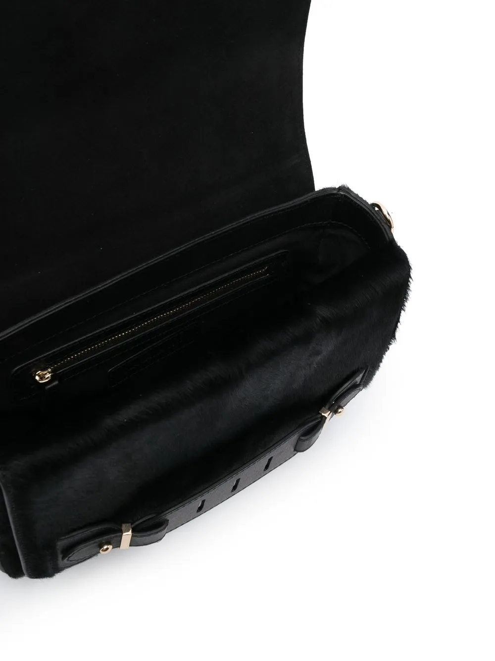 Черный, телячья кожа, материал с эффектом матлассе, золотистая фурнитура, золотистый металлический логотип, откидной клапан и ремешок-цепочка на плечо.