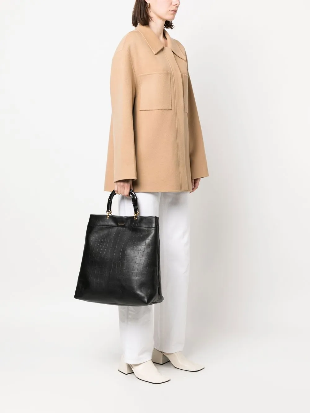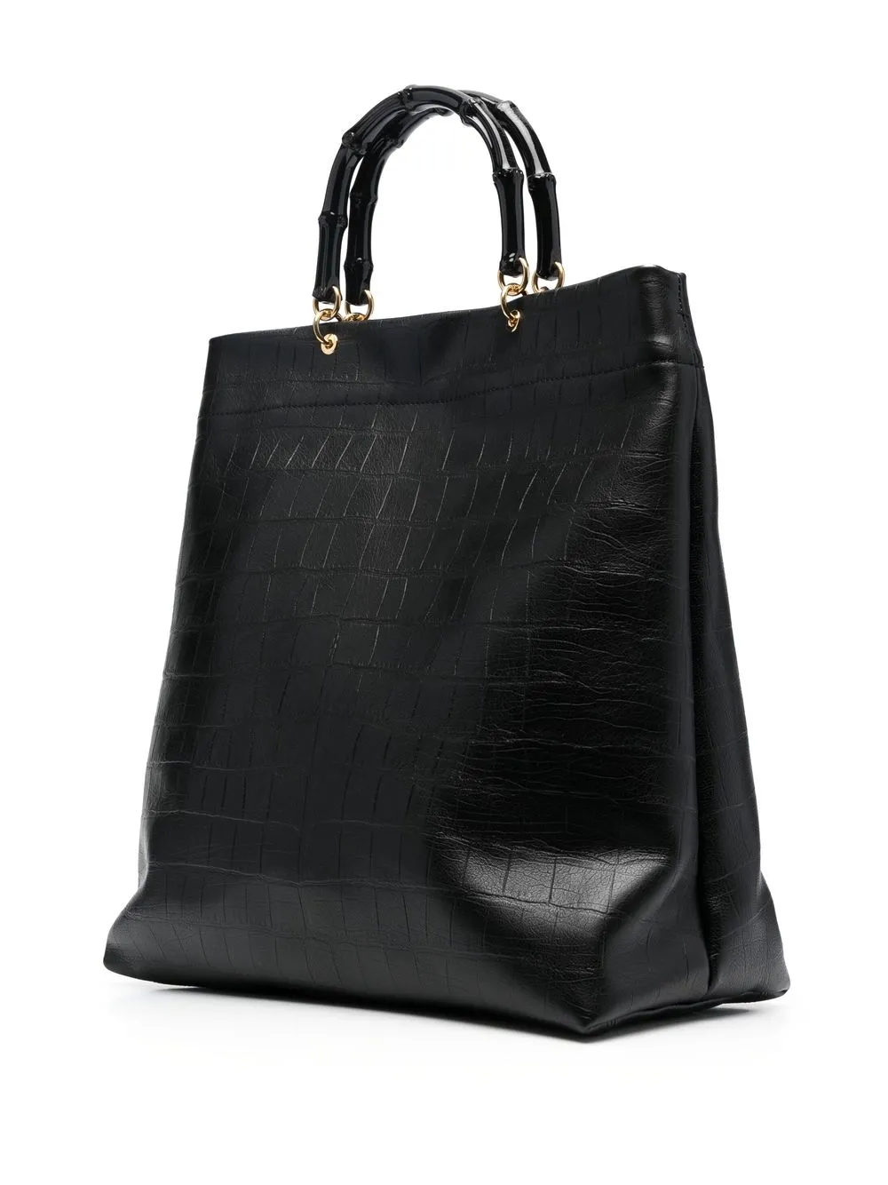 Черный, телячья кожа, тиснение под кожу крокодила, детали из бамбука, золотистый металлический логотип, две верхние ручки, съемный регулируемый ремень на плечо, магнитная застежка и основное отделение.