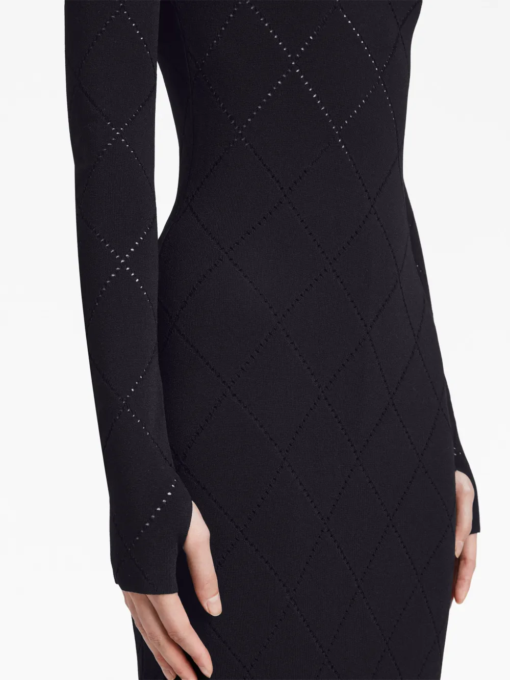 Черный, кружевное вязание, вырезные детали, высокий воротник, длинные рукава, прямой подол и длина миди.