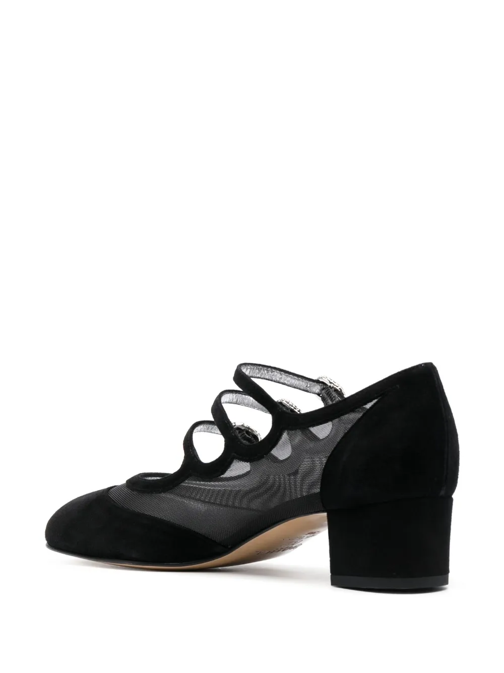 Черный, телячья кожа, замша, сетчатые вставки, ремешок на щиколотке с пряжкой, миндалевидный носок, низкий блочный каблук и кожаная стелька с логотипом.