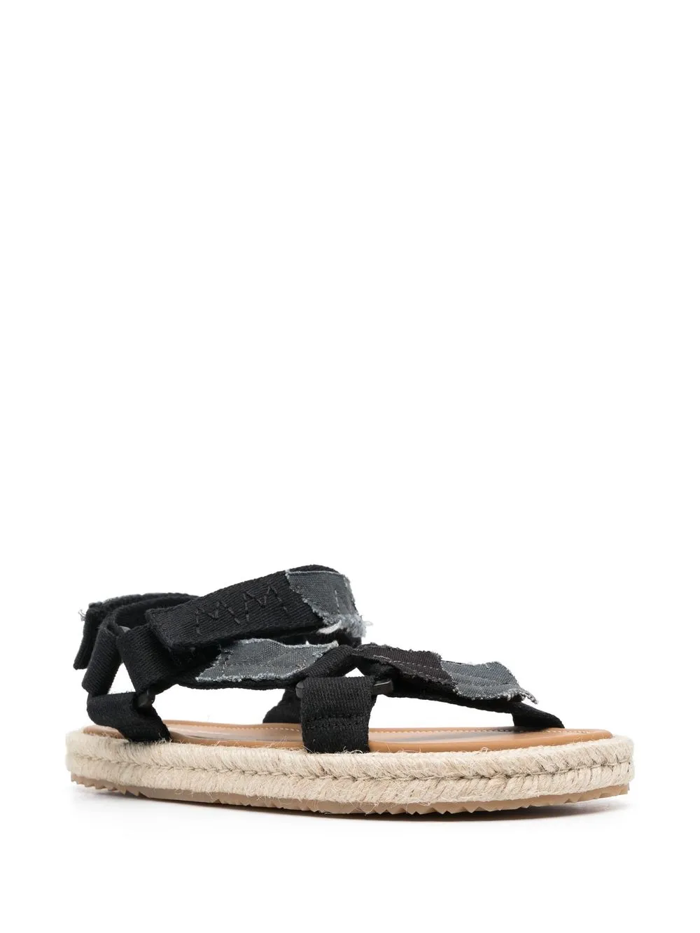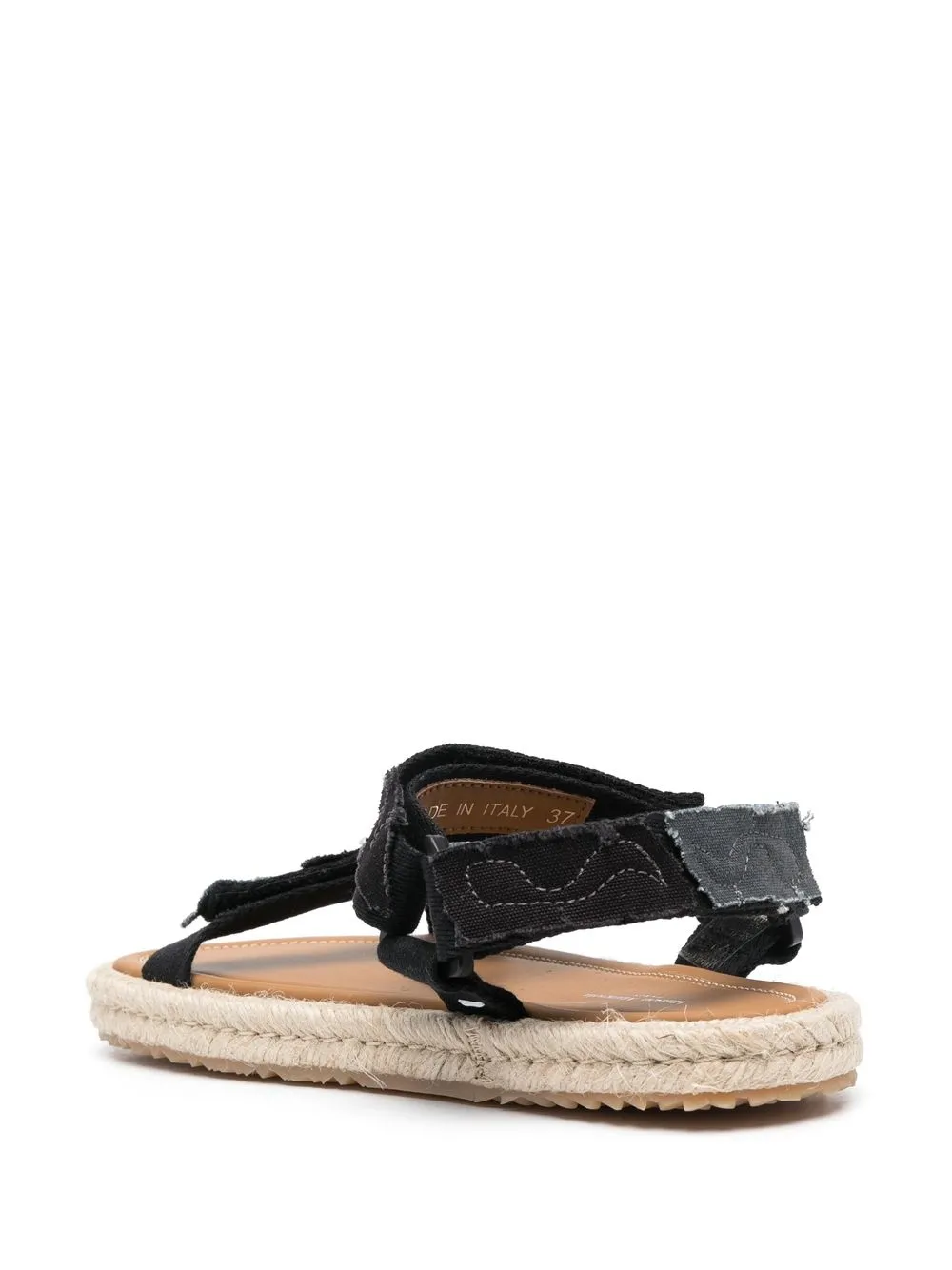Черный, джут, манжеты на липучках, открытый носок и плетеная подошва из рафии.