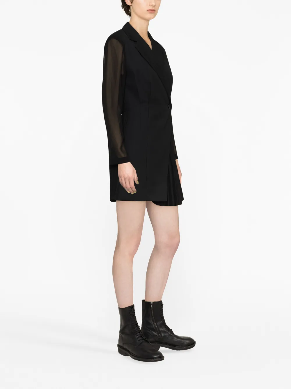 Черный, смесовая необработанная шерсть, зазубренные лацканы, смещенная застежка на пуговицах спереди, длинные прозрачные рукава, плиссированная юбка и длина до бедер.