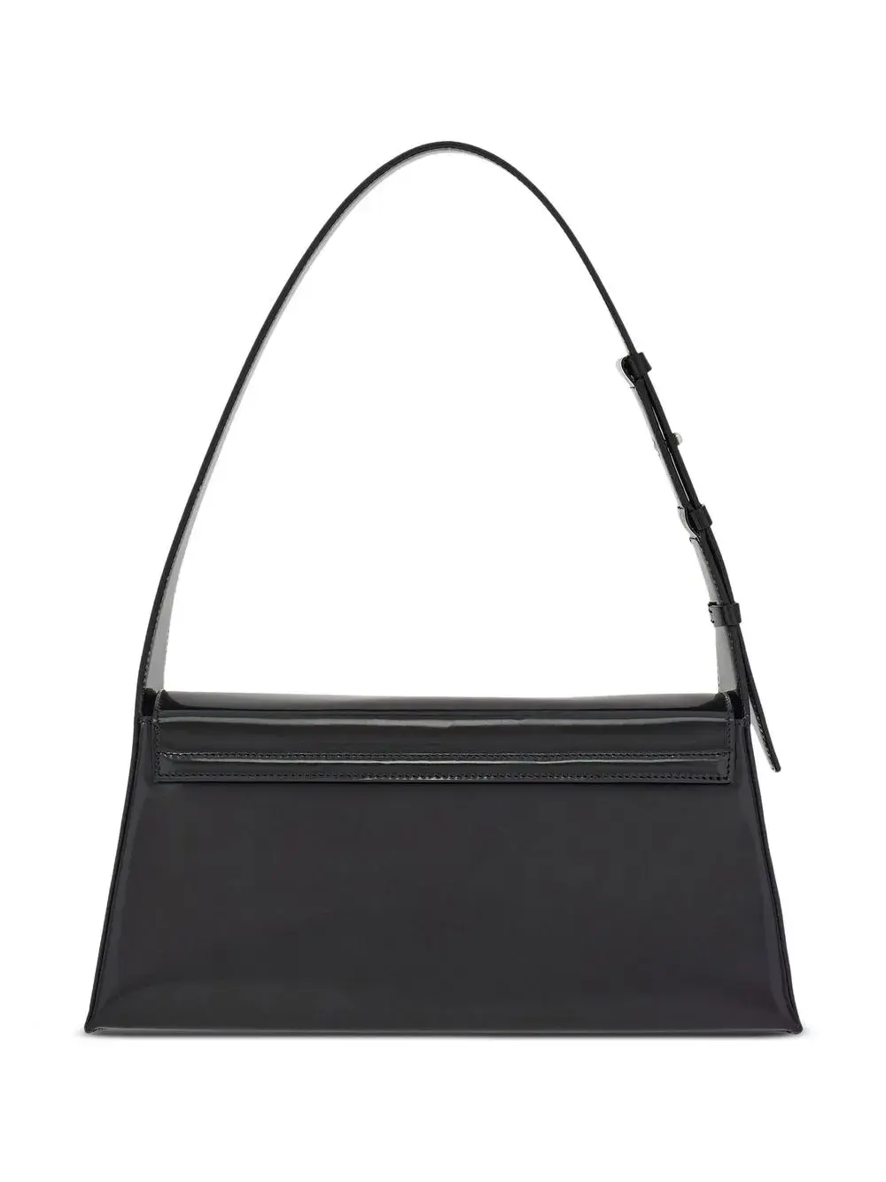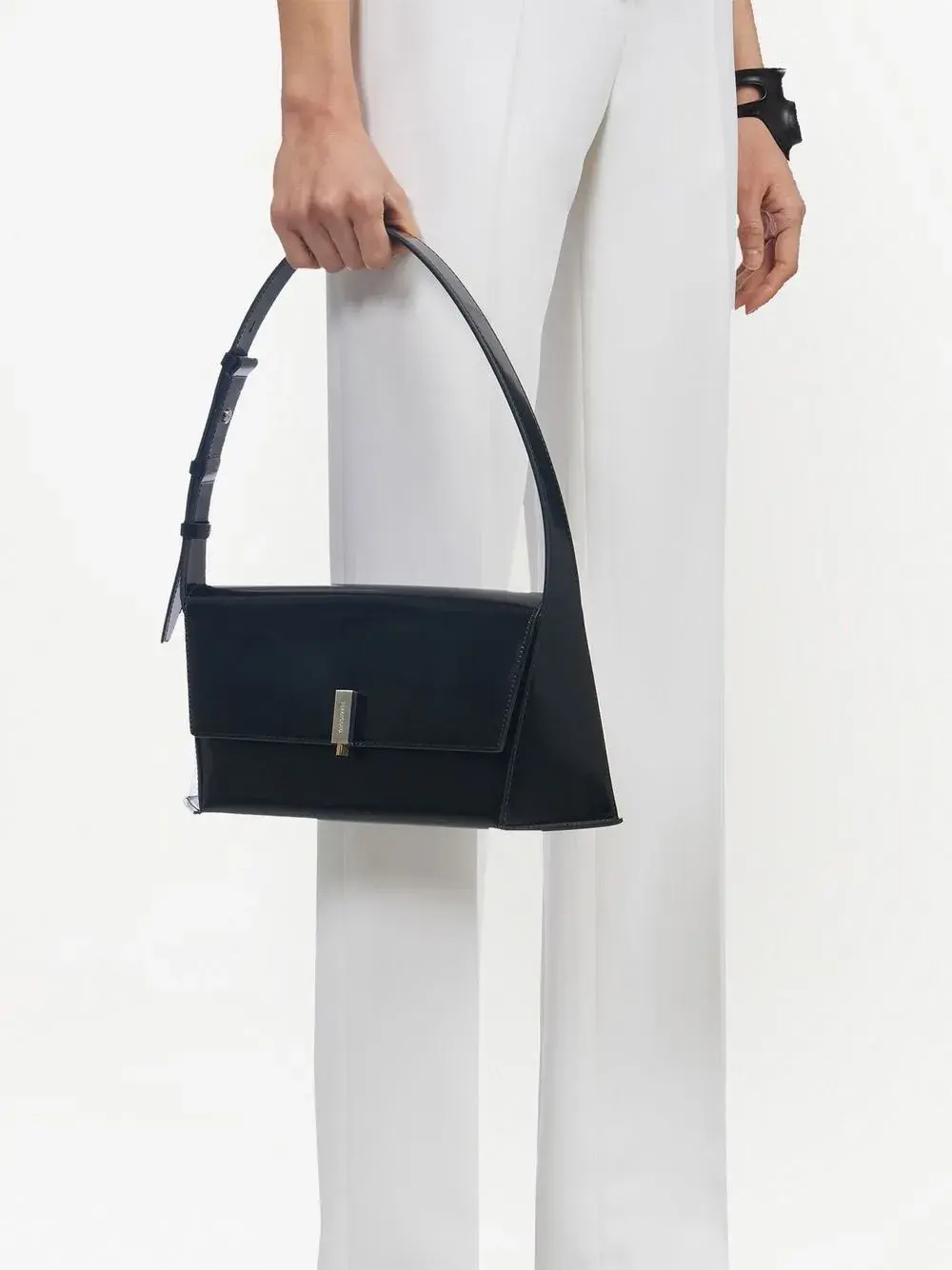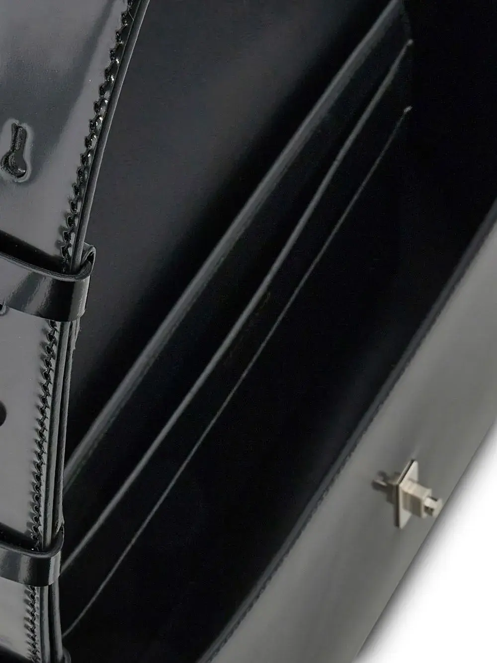 Черный, телячья кожа, лакированная отделка, серебристая фурнитура, серебристый металлический логотип, выгравированный логотип, откидной клапан, основное отделение и регулируемая ручка.