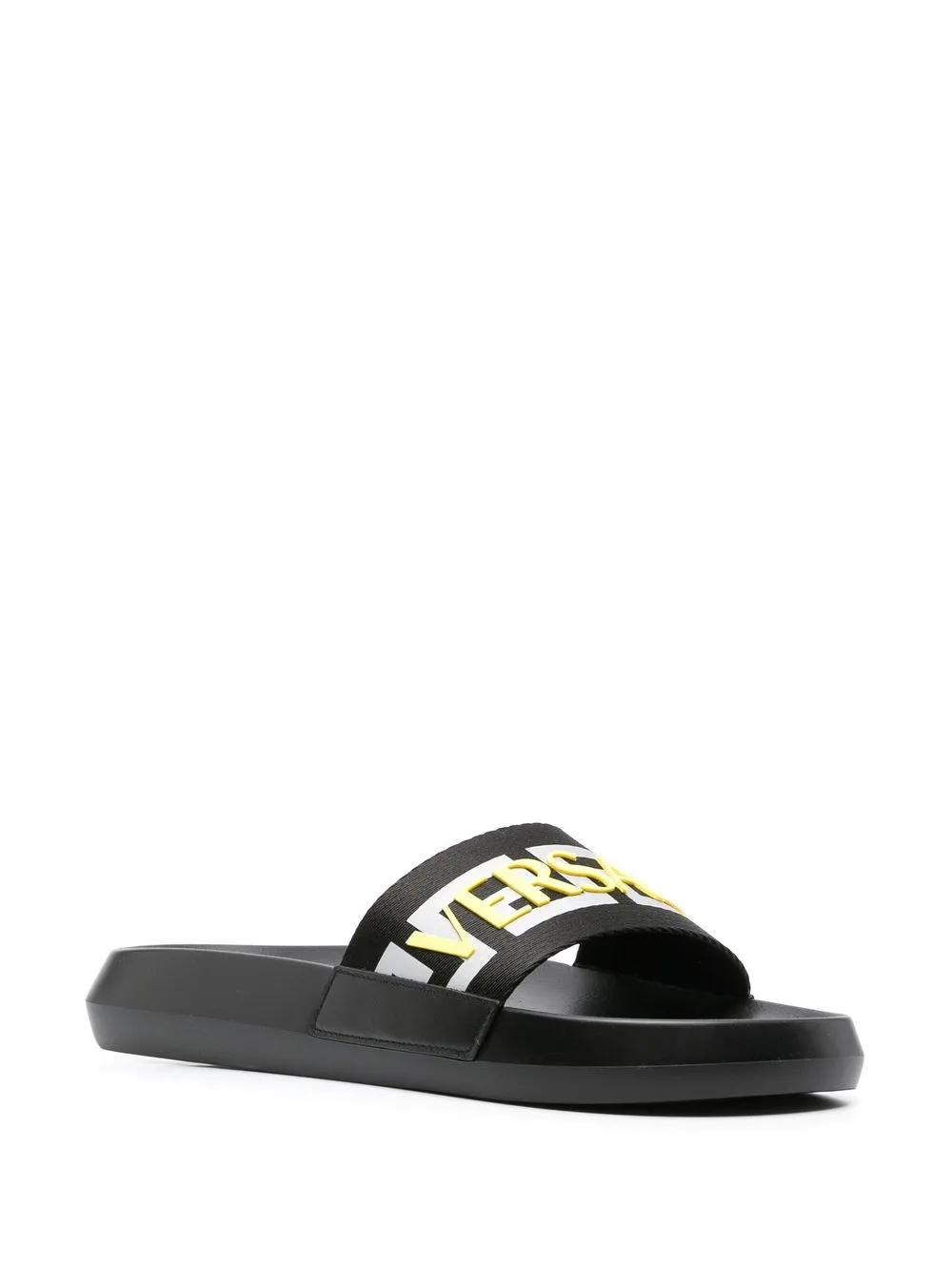 Черный, логотип, знаковый принт La Greca, модель без застежки, открытый носок и плоская резиновая подошва.