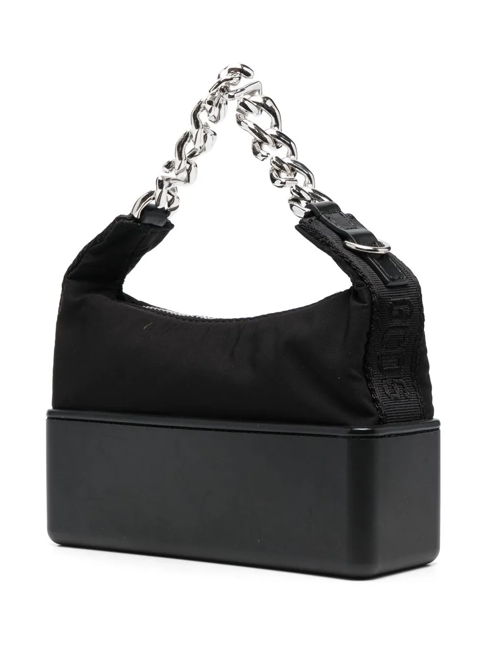Черный, телячья кожа, тисненый логотип спереди, застежка на молнии сверху, ремень на плечо с логотипом, цепочный ремень и основное отделение.