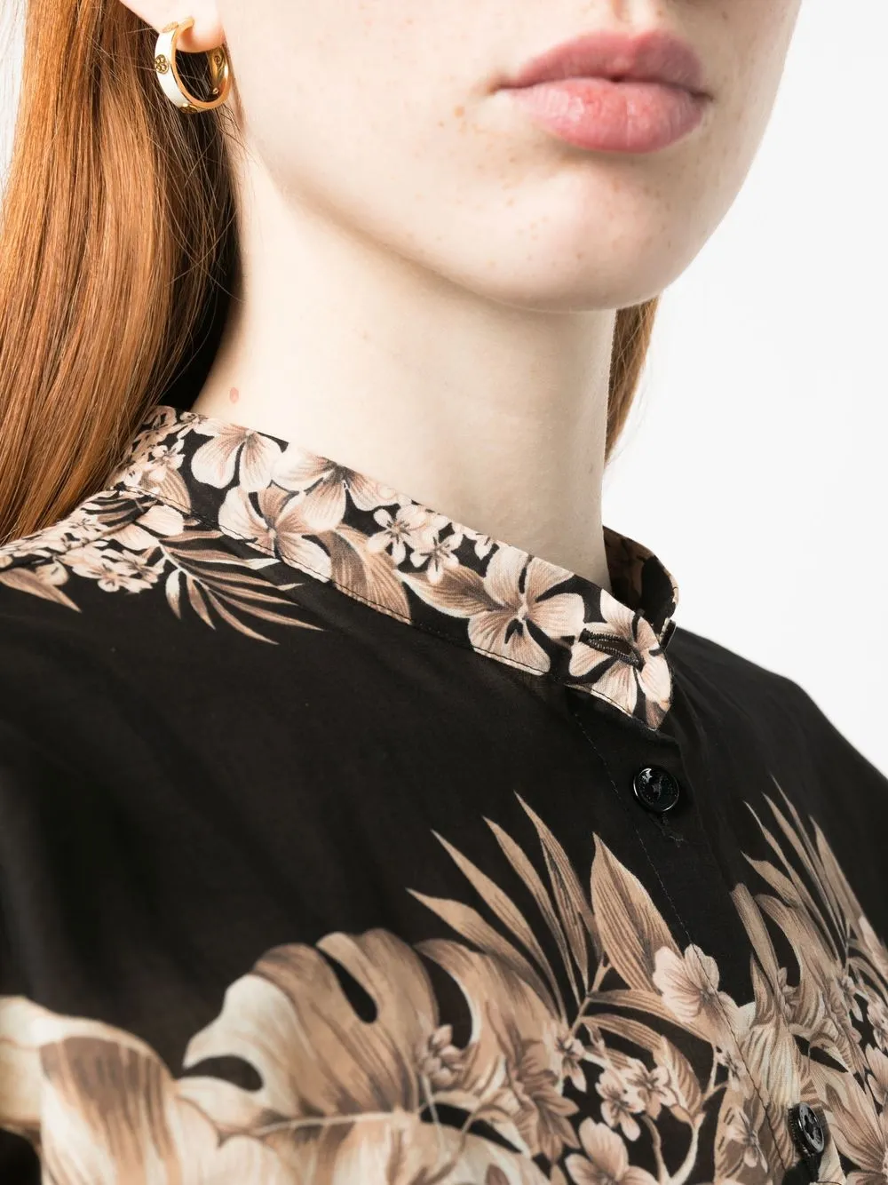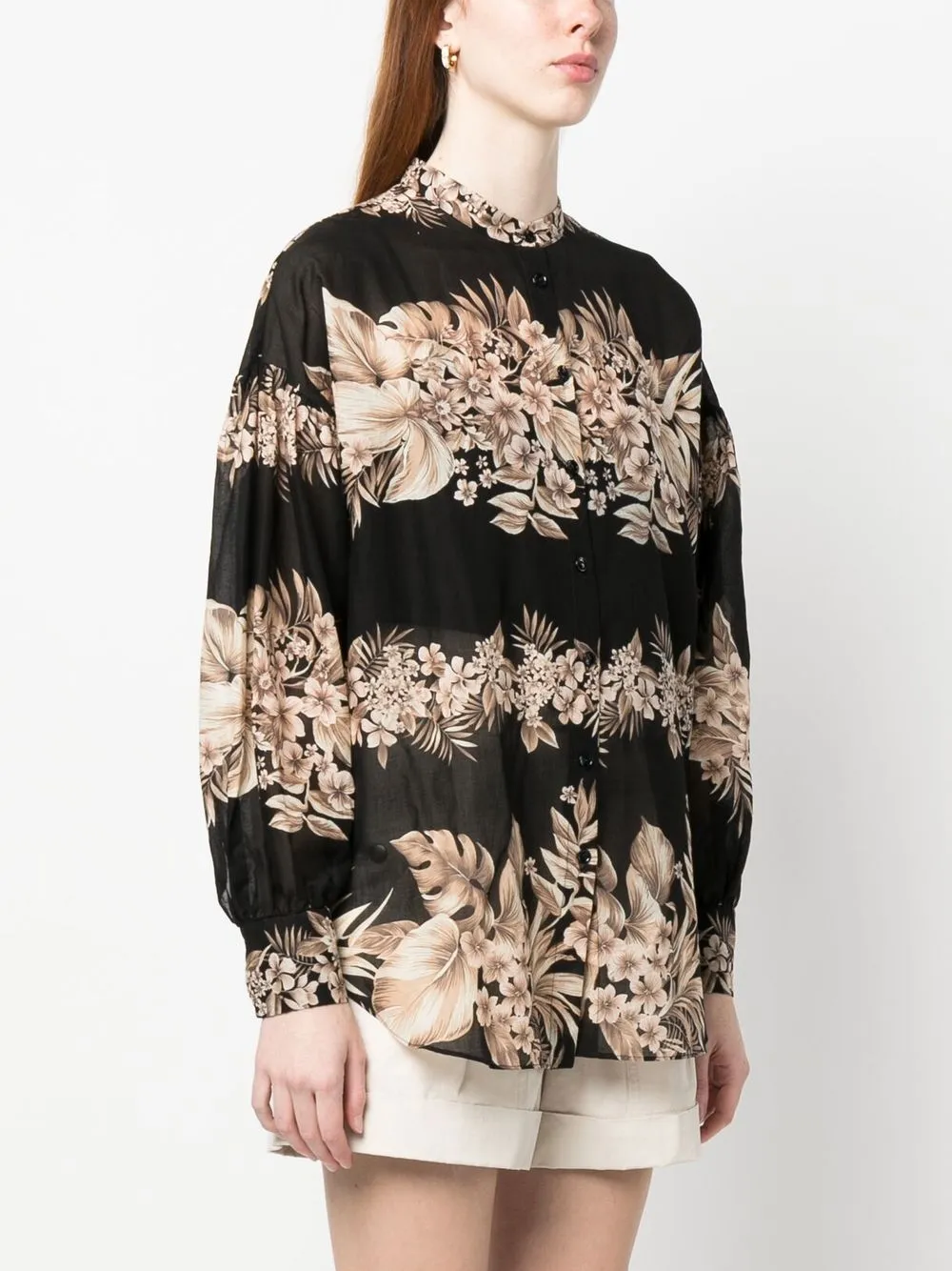 Черный, бежевый, хлопок, сплошной цветочный принт, полупрозрачный дизайн, воротник-стойка, застежка на пуговицах спереди и рукава с узкими манжетами.