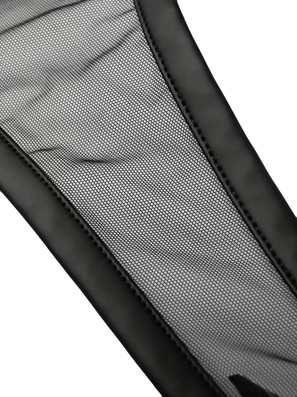 Черный, эластичный материал, вырезные детали, металлические кольца, золотистая фурнитура, регулируемый дизайн, регулируемые тонкие бретели, чашка на косточках и застежка на крючок сзади. Эту вещь можно примерить, но только поверх собственного белья.