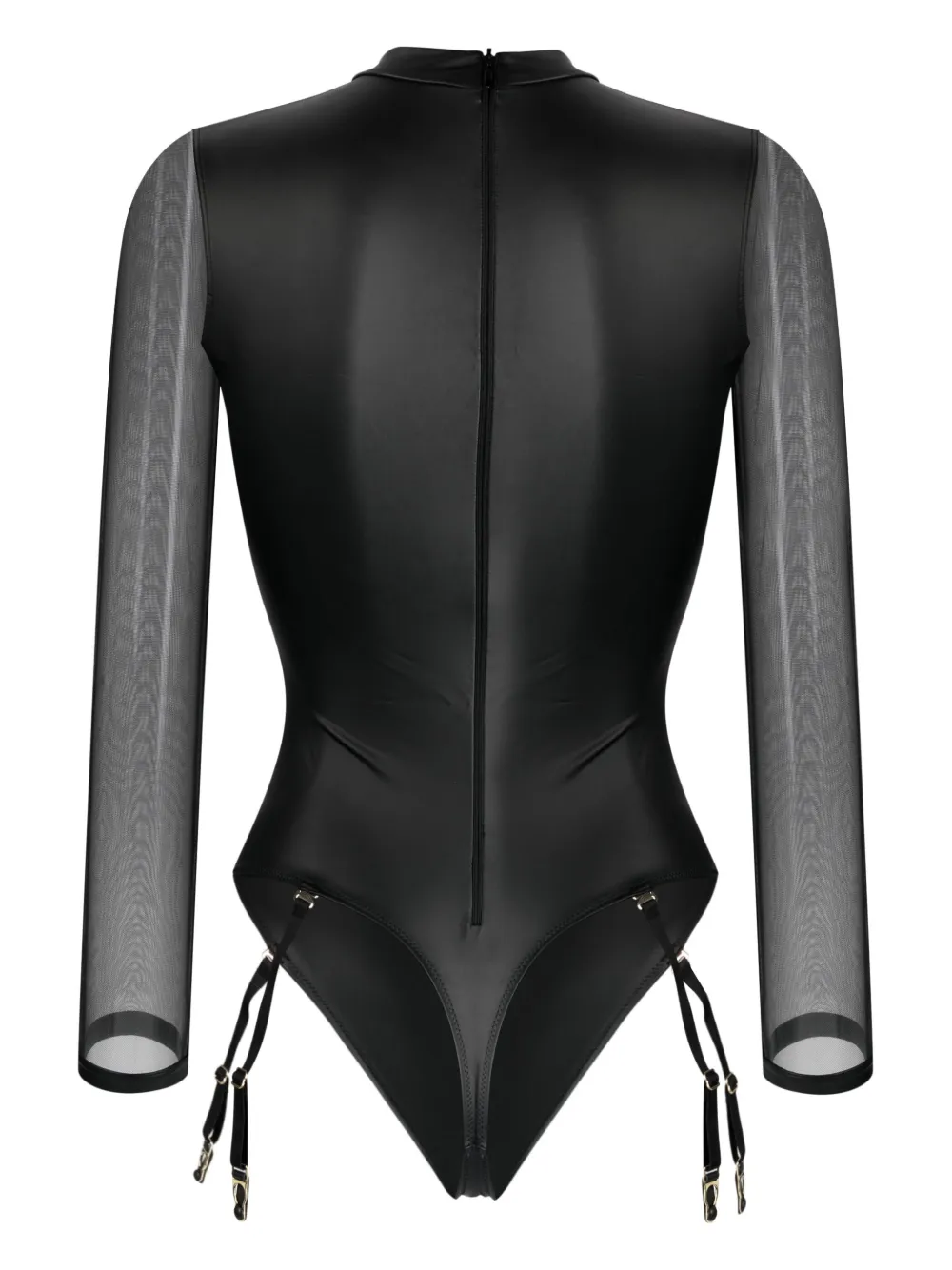 Черный, эластичный материал, полупрозрачные рукава, металлические кольца, золотистая фурнитура, воротник-стойка, застежка на молнии сзади, длинные рукава, стринги и регулируемые боковые резинки. Эту вещь можно примерить, но только поверх собственного белья.