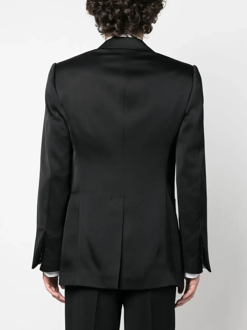 Черный, смесь хлопка и шелка, двубортная застежка на кнопки, зазубренные лацканы, прорезной карман на груди, два передних кармана с листочкой и вырез сзади.