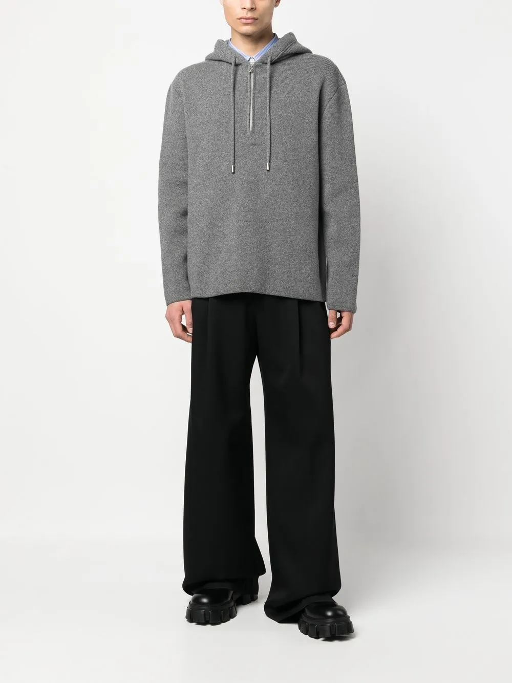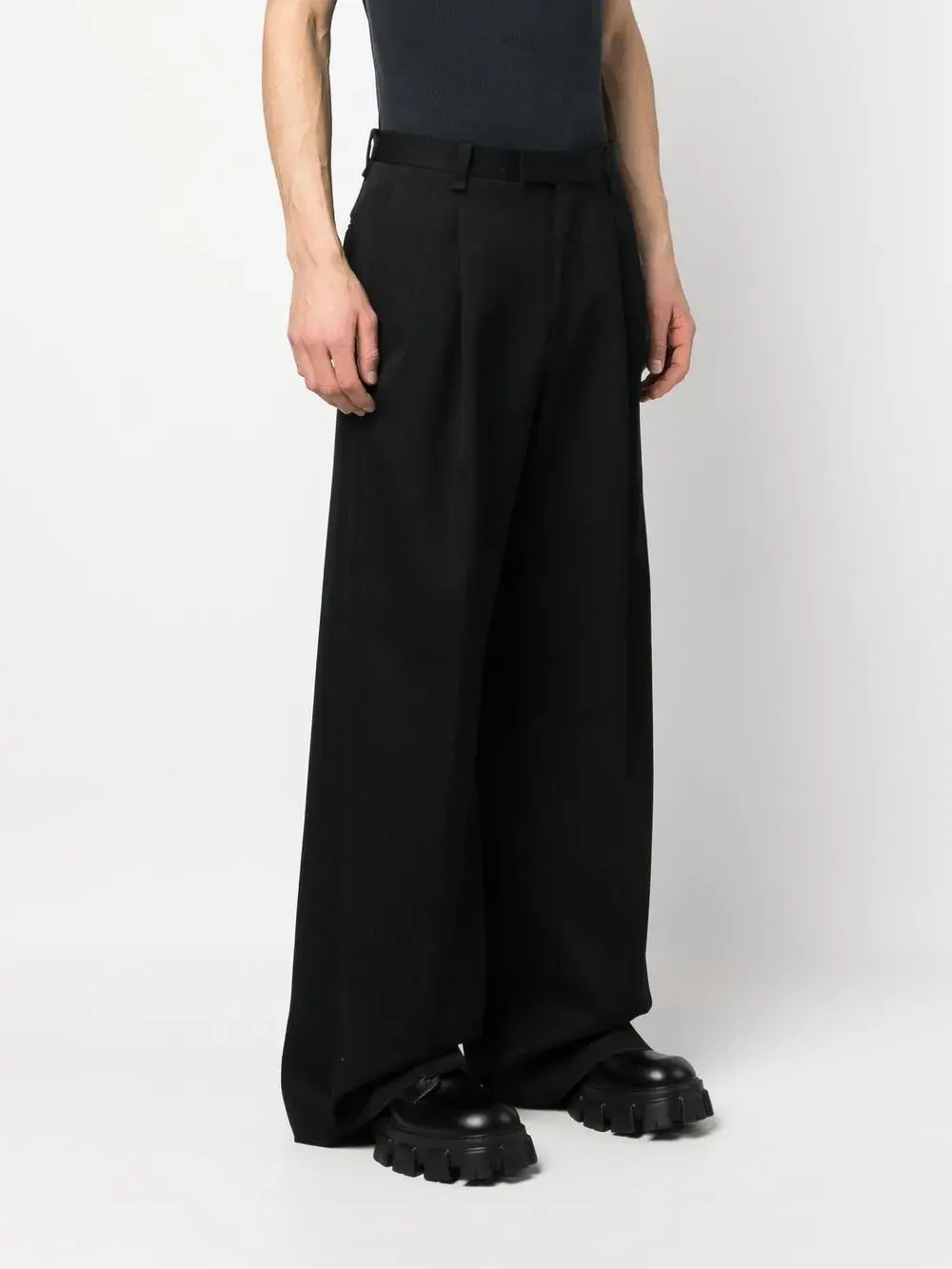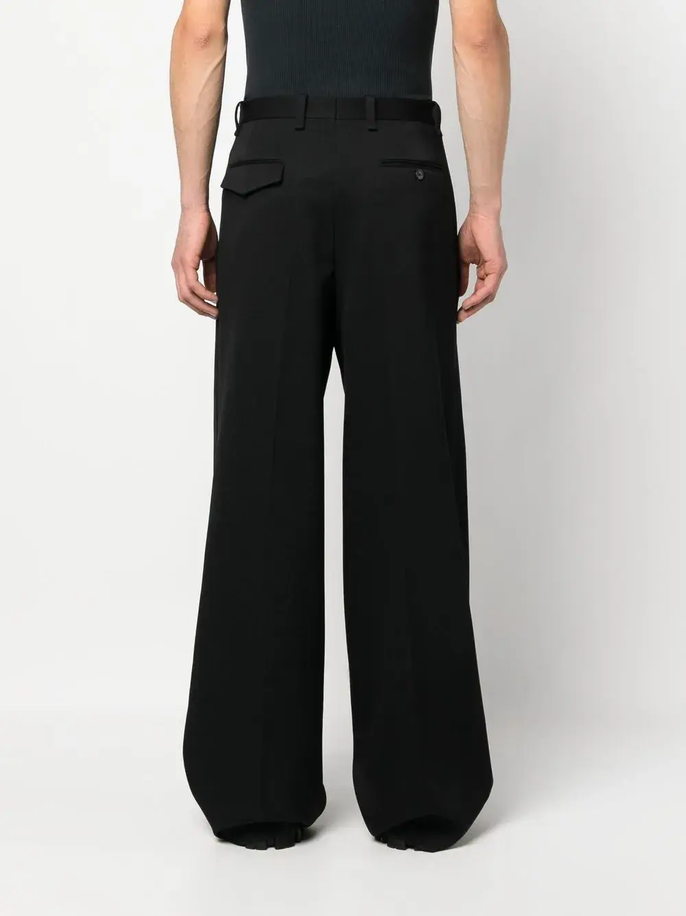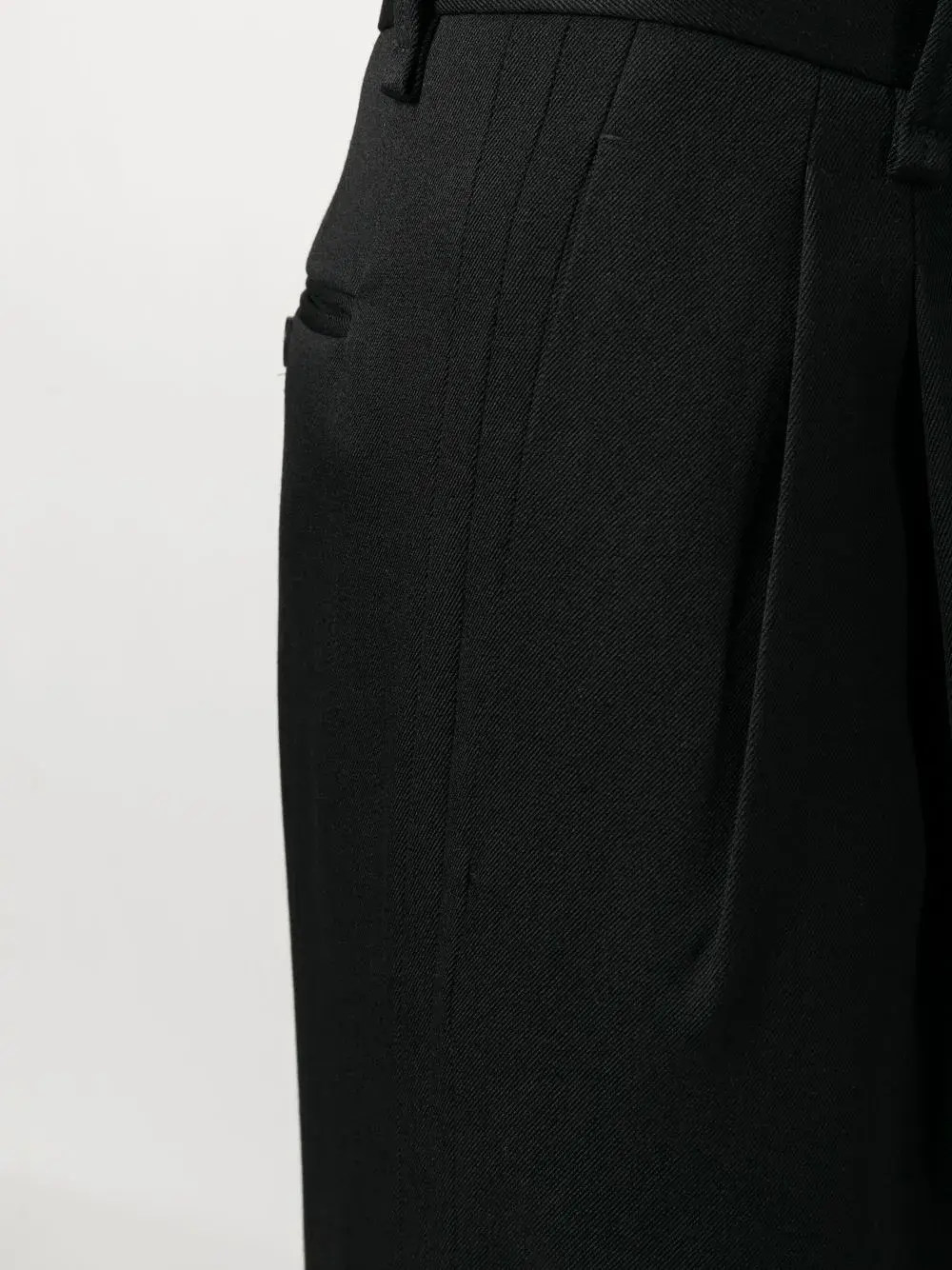 Черный, шерсть, складки, петли для ремня, потайная застежка спереди, два прорезных кармана по бокам, задние карманы с листочкой и карман с клапаном сзади.