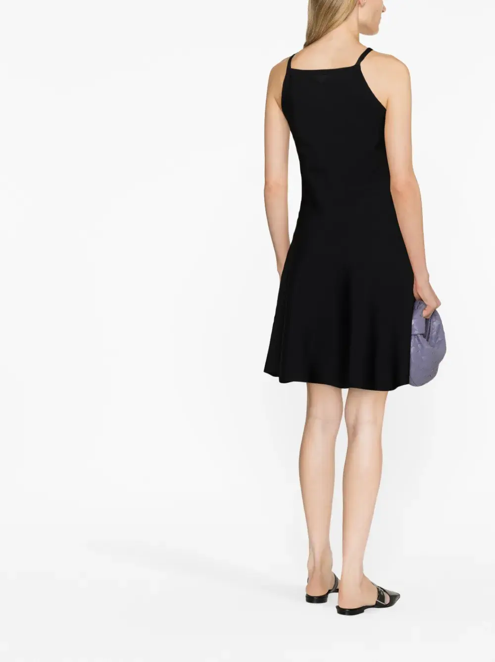 Черный, треугольный логотип, расклешенная юбка, без рукавов, квадратный вырез, застежка на молнии сбоку, длина до бедер и прямой подол.