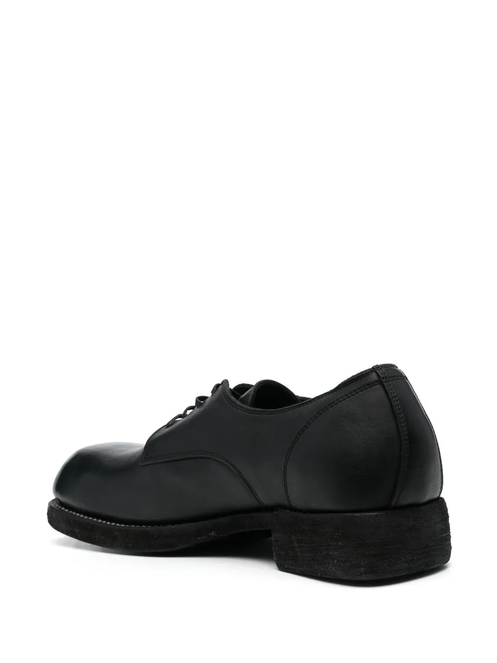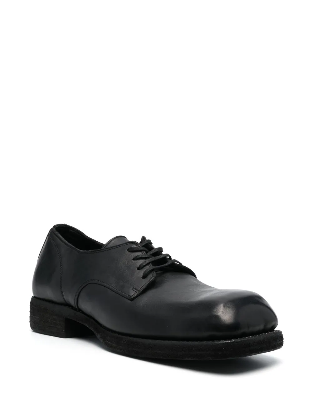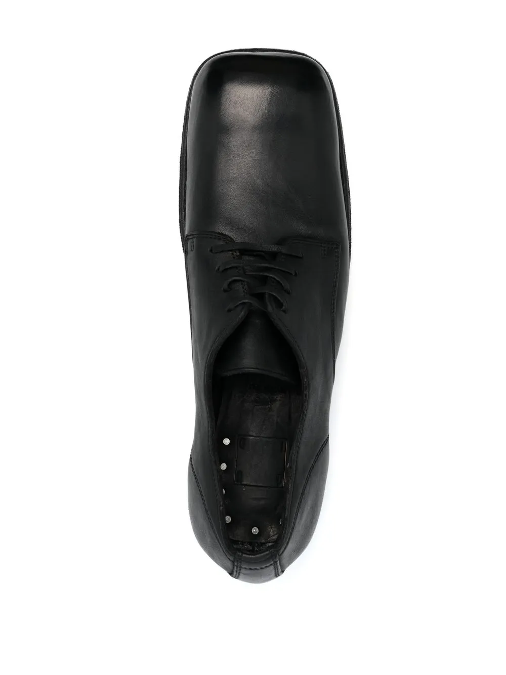 Черный, телячья кожа, квадратный носок, шнуровка спереди, низкий блочный каблук и кожаная стелька с логотипом.