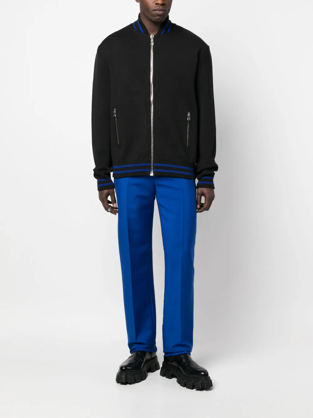 Черный, смесь хлопка и шерсти, трикотажный материал, полоски, бейсбольный воротник, застежка на молнии спереди, передние карманы на молнии, приспущенные плечи, длинные рукава и нашивка с логотипом сзади.