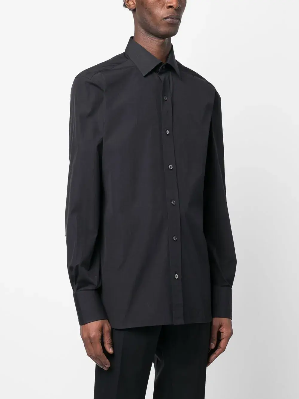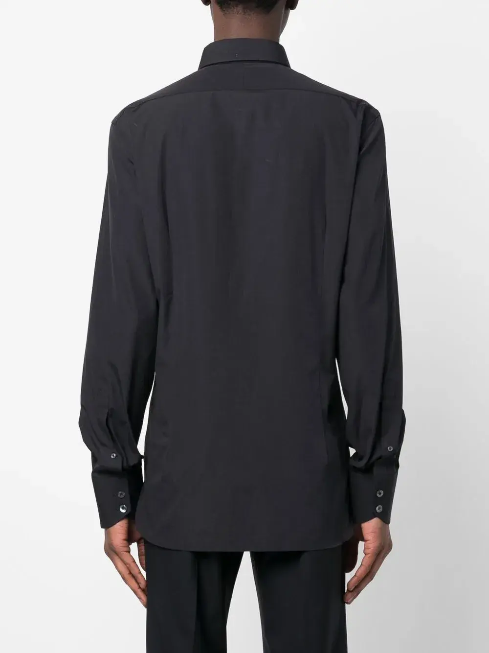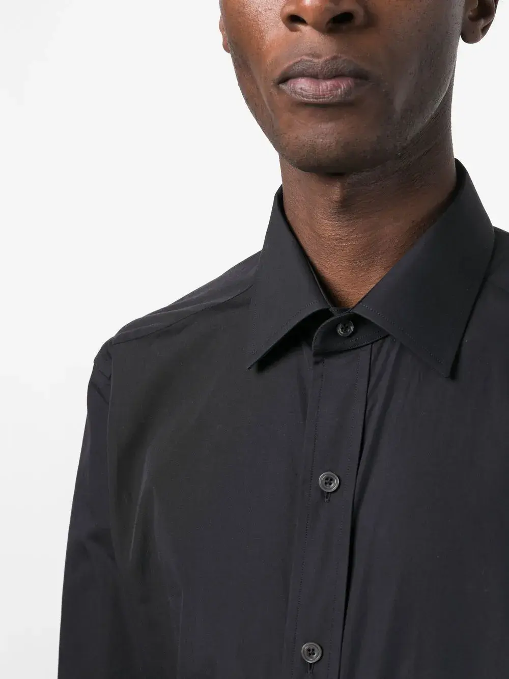 Черный, хлопок, классический воротник, застежка на пуговицах спереди, длинные рукава, манжеты на пуговицах и прямой подол.
