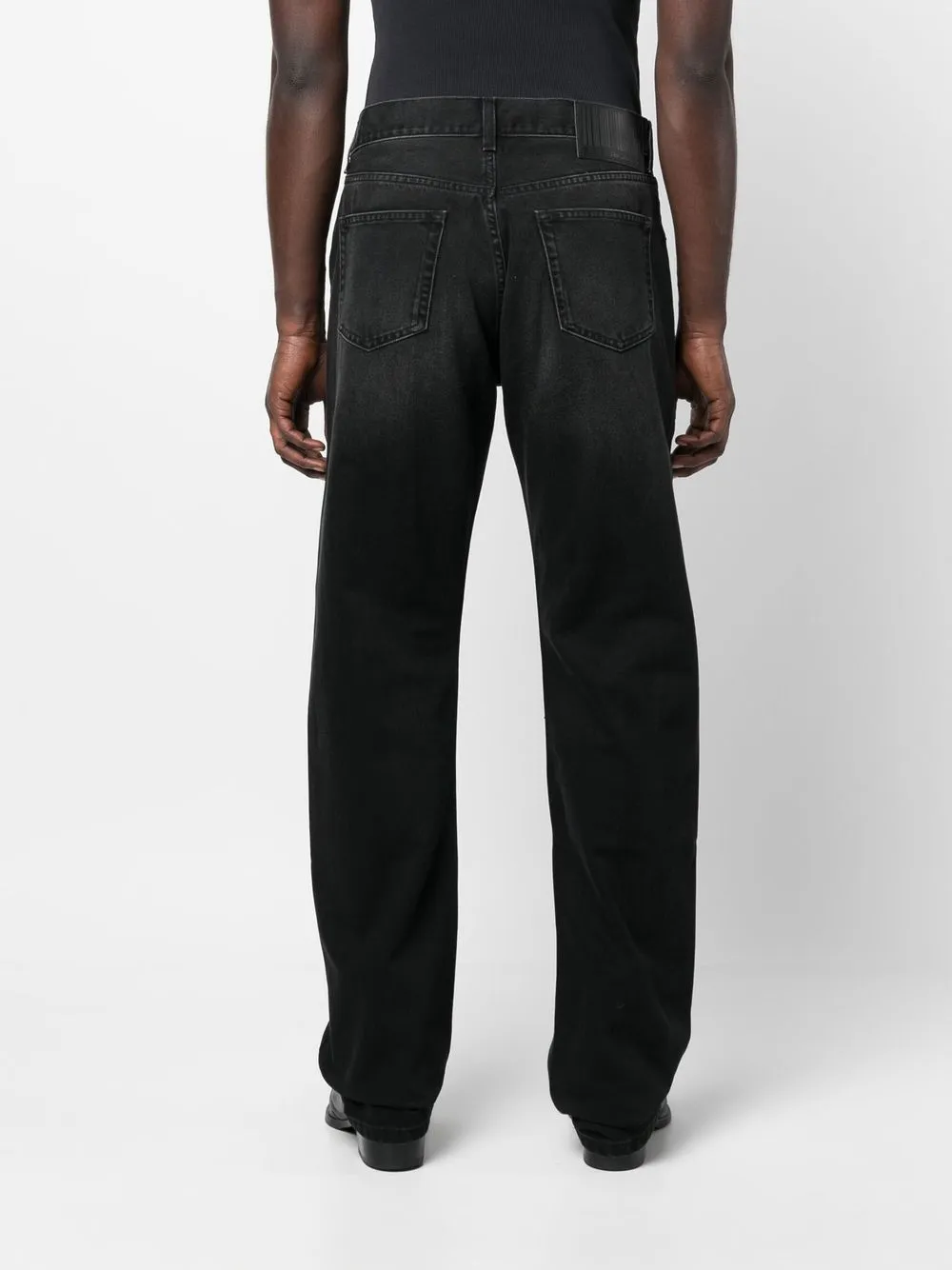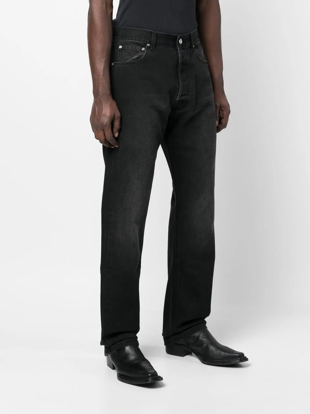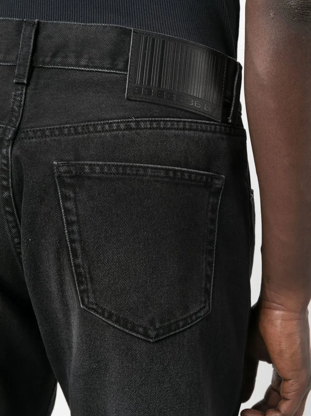 Черный, хлопок, обработанный деним, нашивка с логотипом сзади, петли для ремня, застежка на молнии и пуговице спереди и пять карманов.