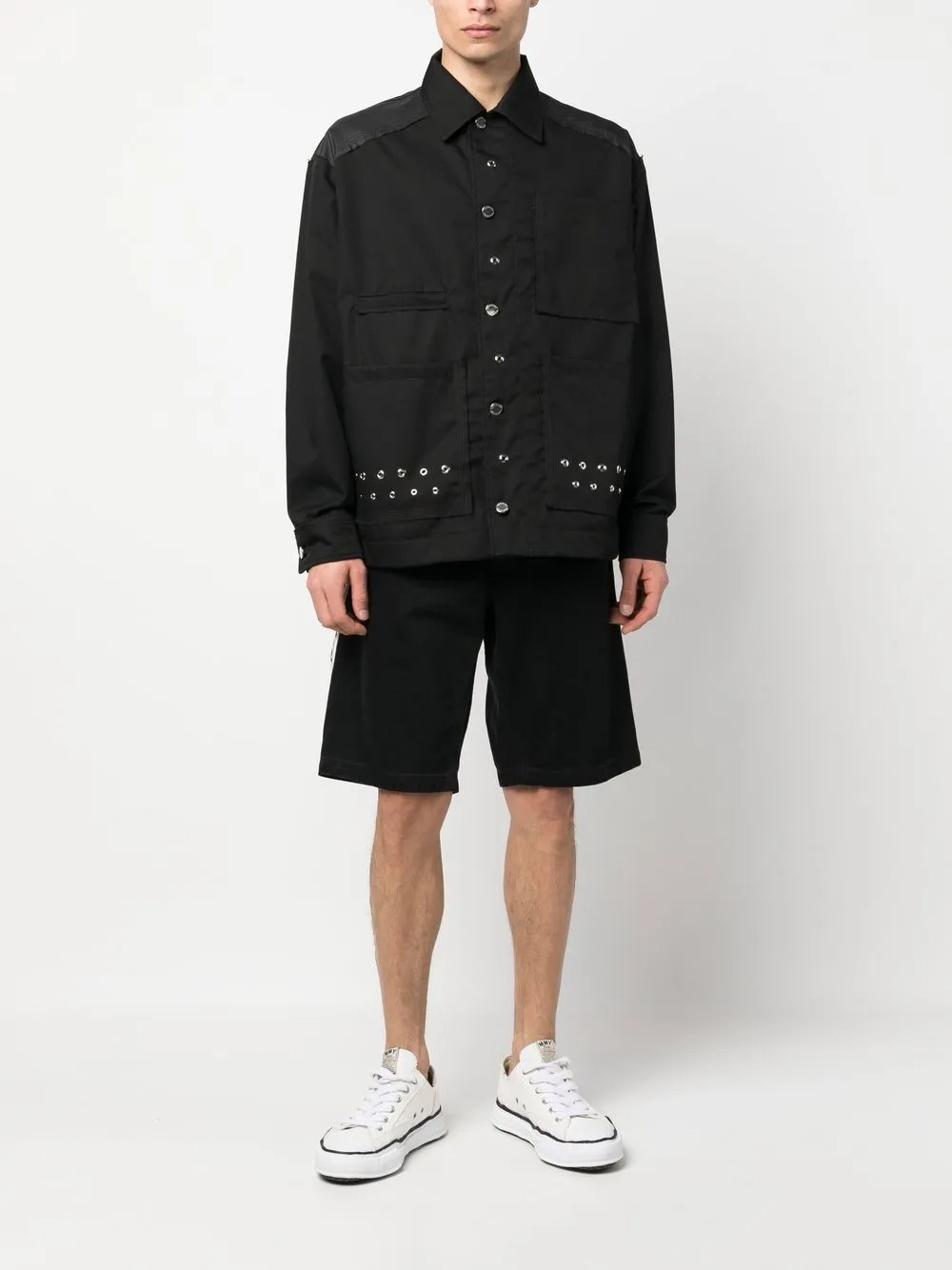 Черный, отделка металлическими люверсами, косой воротник, длинные рукава, рукава с манжетами на пуговицах, застежка на пуговицы и несколько накладных карманов.