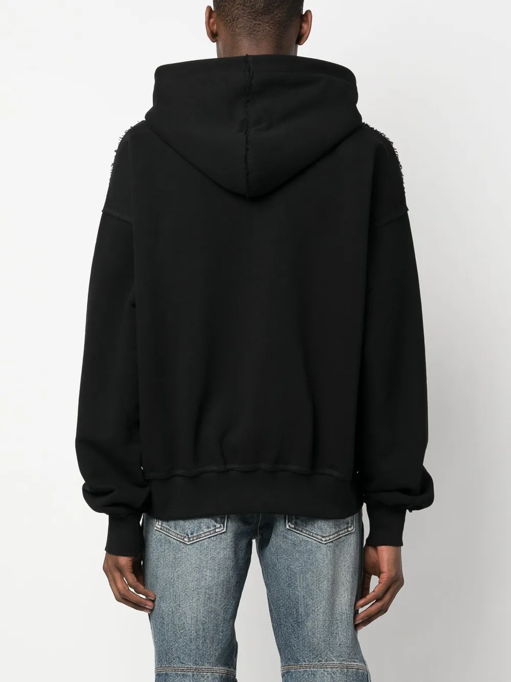 Черный, смесовый хлопок, графичный принт спереди, классический капюшон, длинные рукава и приспущенные плечи.