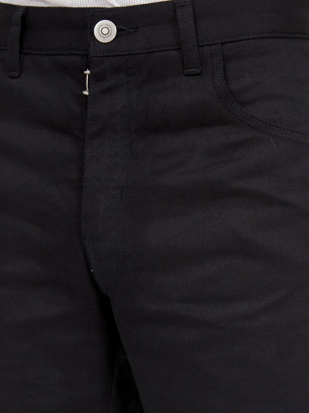 Черный, смесовый хлопок, деним, эластичный материал, нашивка с логотипом, контрастная строчка, петли для ремня, застежка на молнии и пуговице спереди, пять карманов, прямой крой и прямой подол.