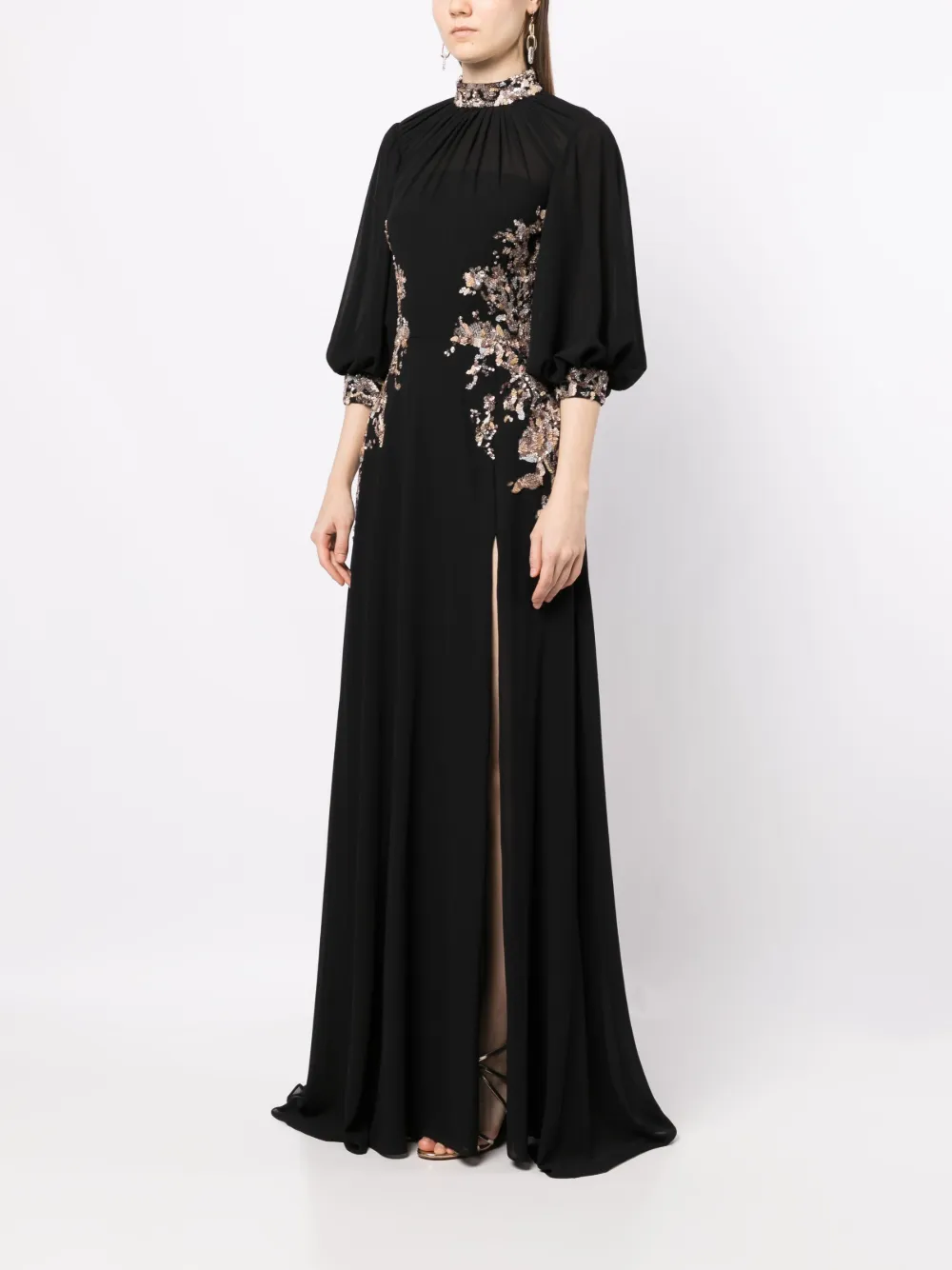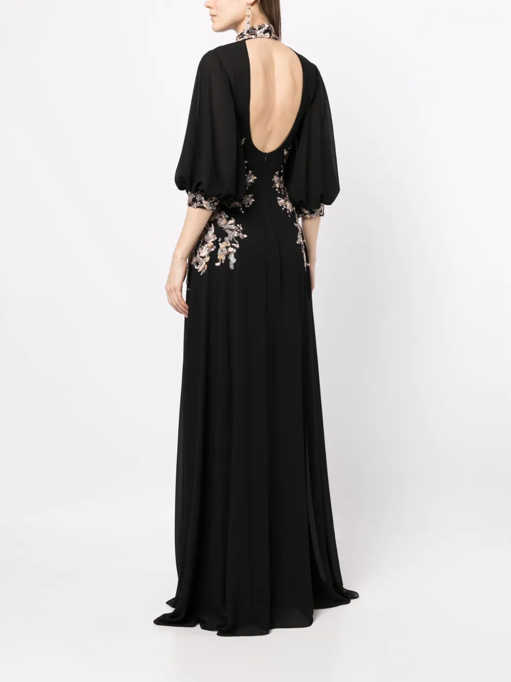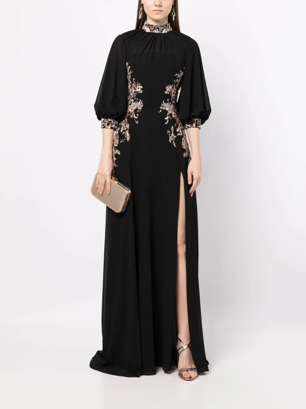 Черный, украшение из пайеток, высокий воротник, открытая спина, пышные рукава три четверти, боковой разрез и длинная модель.