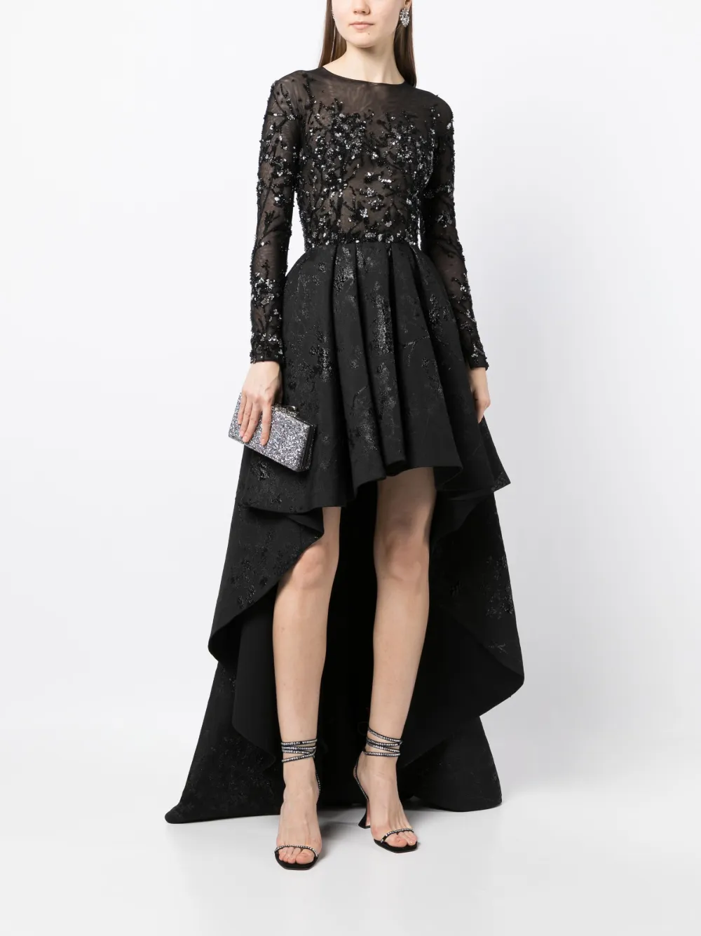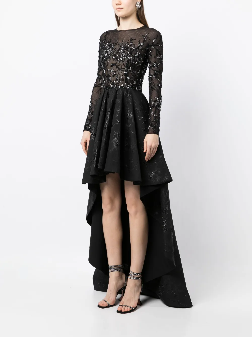 Черный, парчовая ткань, прозрачное покрытие, декор из бисера, круглый вырез, расклешенная юбка и неравномерный подол.