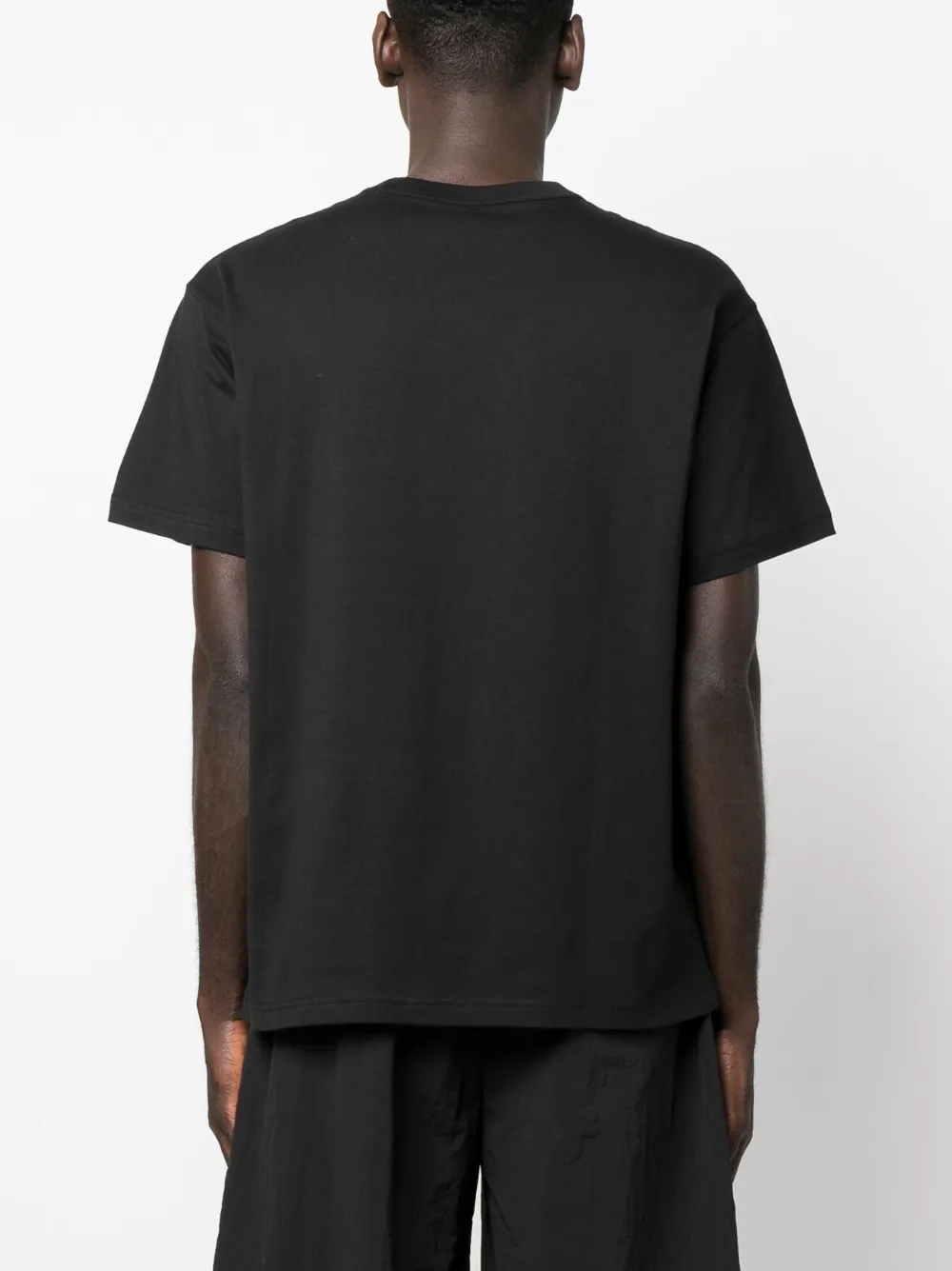 Черный, хлопок, логотип спереди, круглый вырез, короткие рукава и прямой подол.