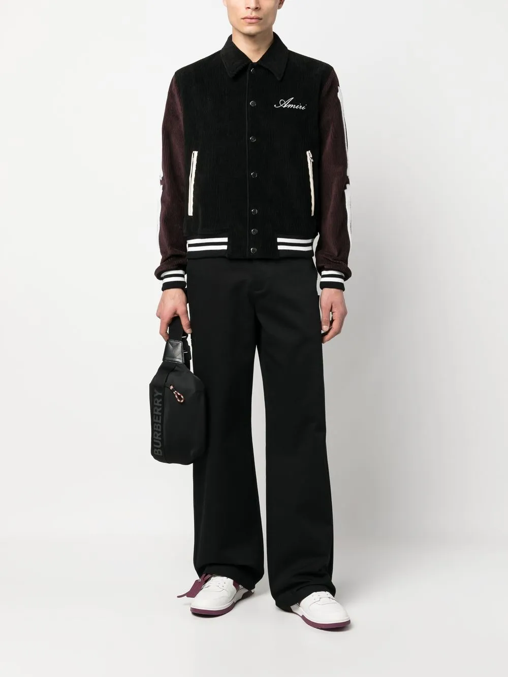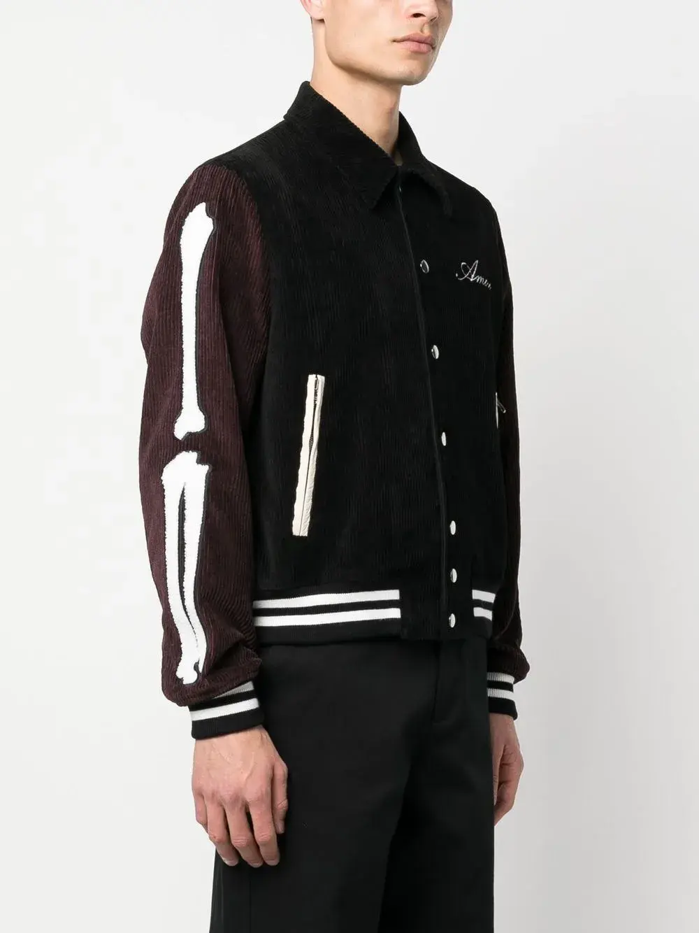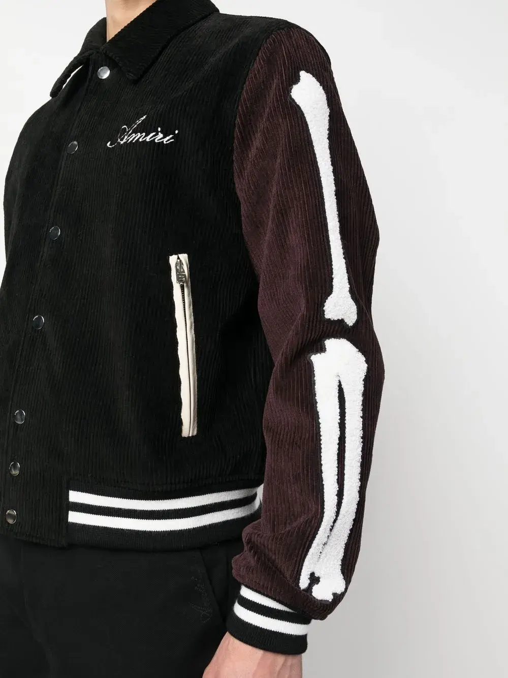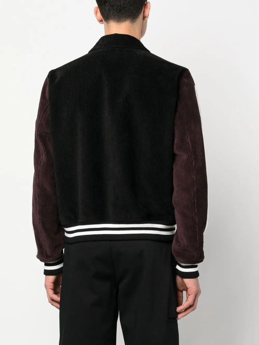 Черный, бордовый, вельветовый материал, вставки, классический воротник, застежка на пуговицах спереди, длинные рукава, два кармана на молнии по бокам и прямой подол.