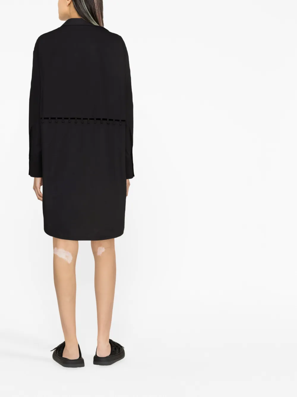 Черный, хлопок, классический воротник, V-образный вырез, вырезные детали, длинные рукава, закругленный подол и длина выше колена.