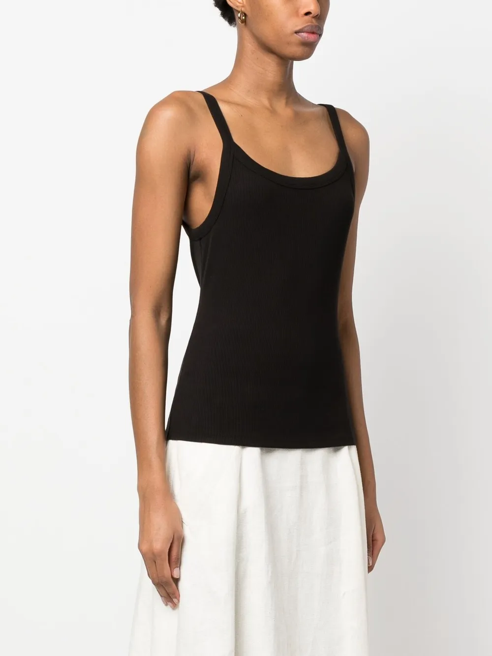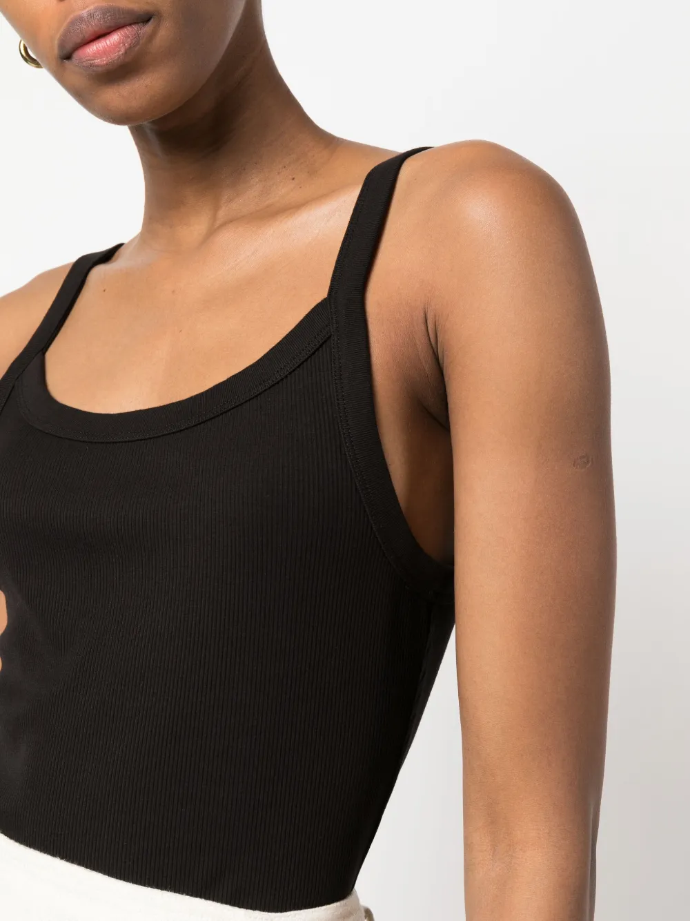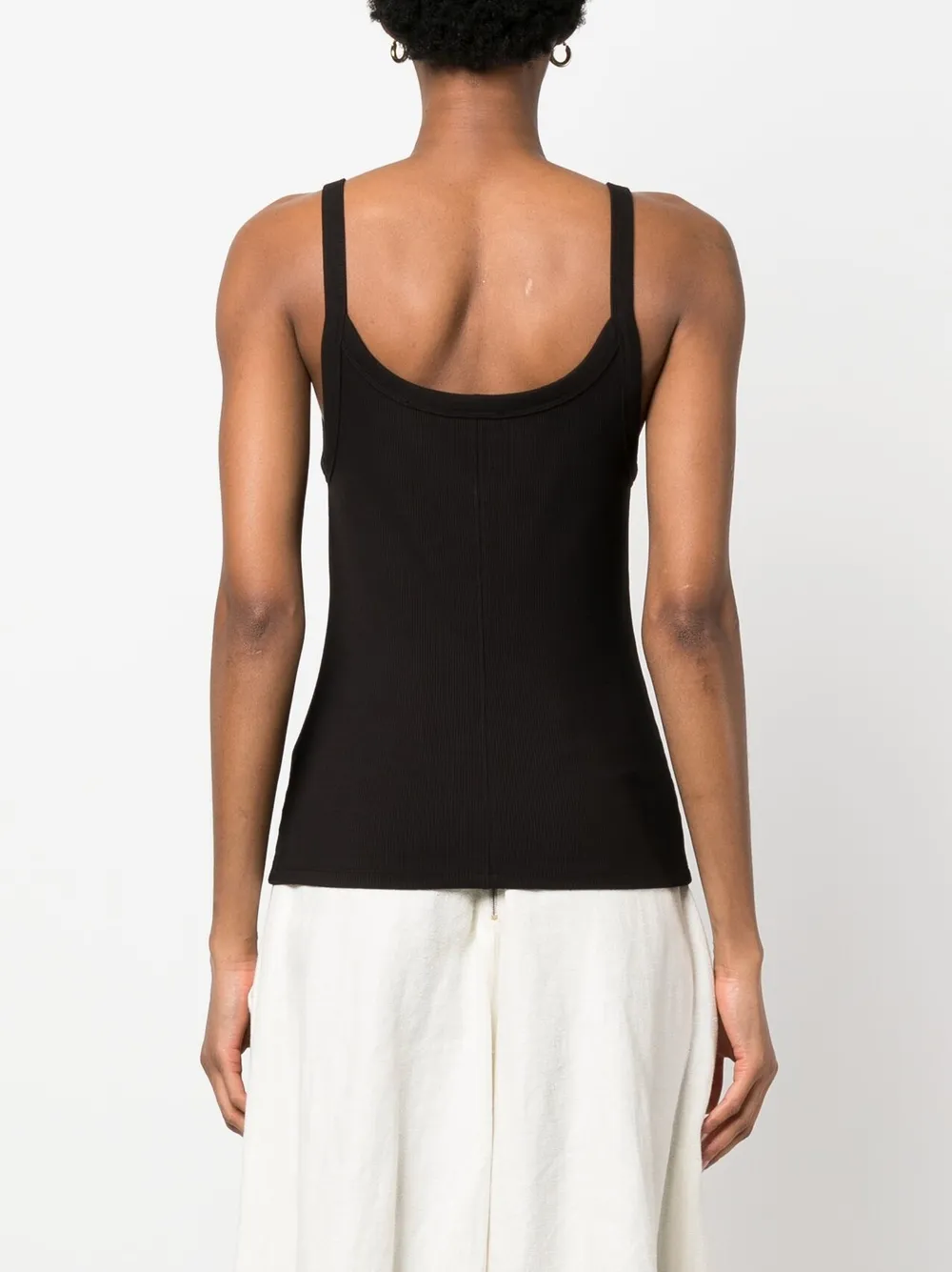 Черный, стрейчевая ткань, трикотаж в рубчик, U-образный вырез, U-образный вырез на спине, без рукавов и прямой подол.