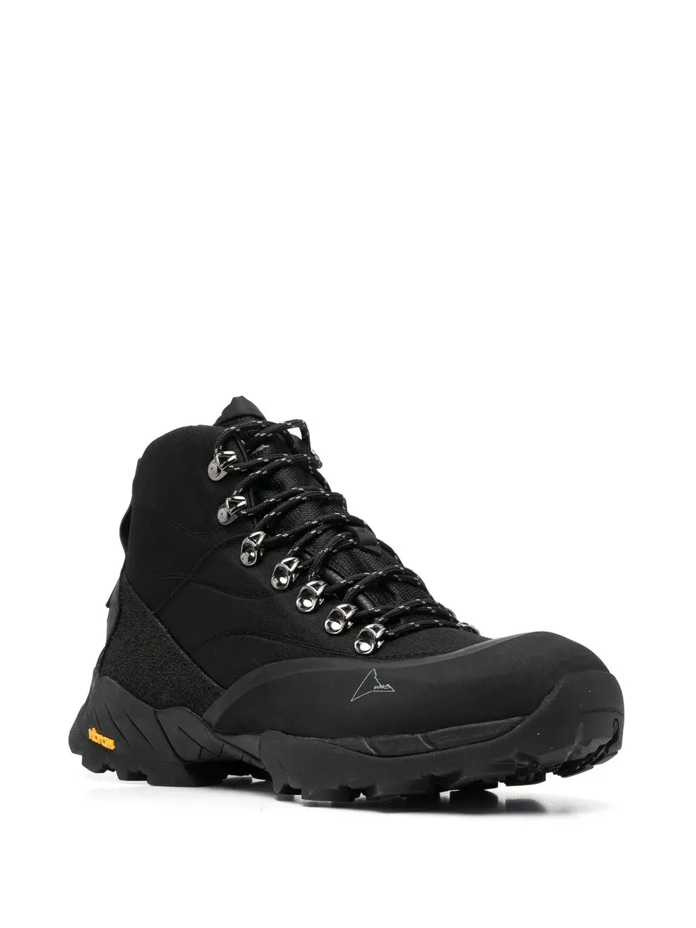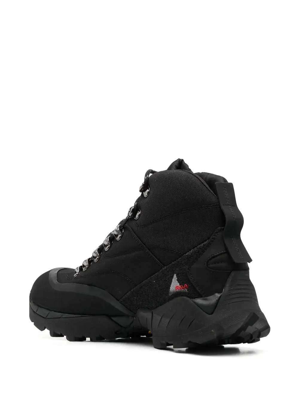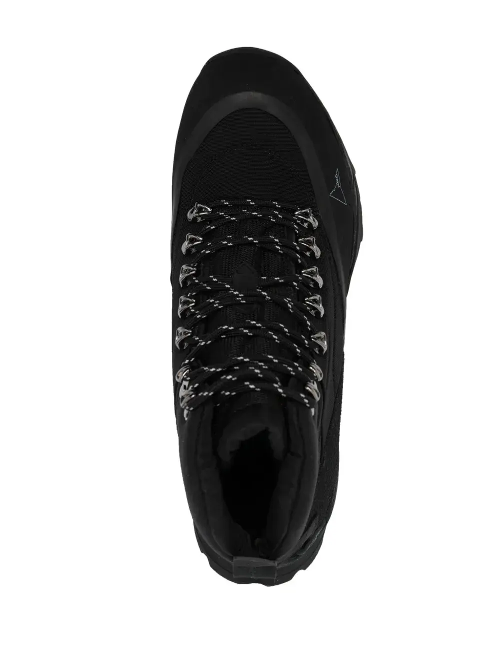 Черный, вставки, кожаные вставки на углах, дутые вставки, вышитый логотип, шнуровка спереди, резиновый ремешок, петля для подтягивания сзади и подошва Vibram.