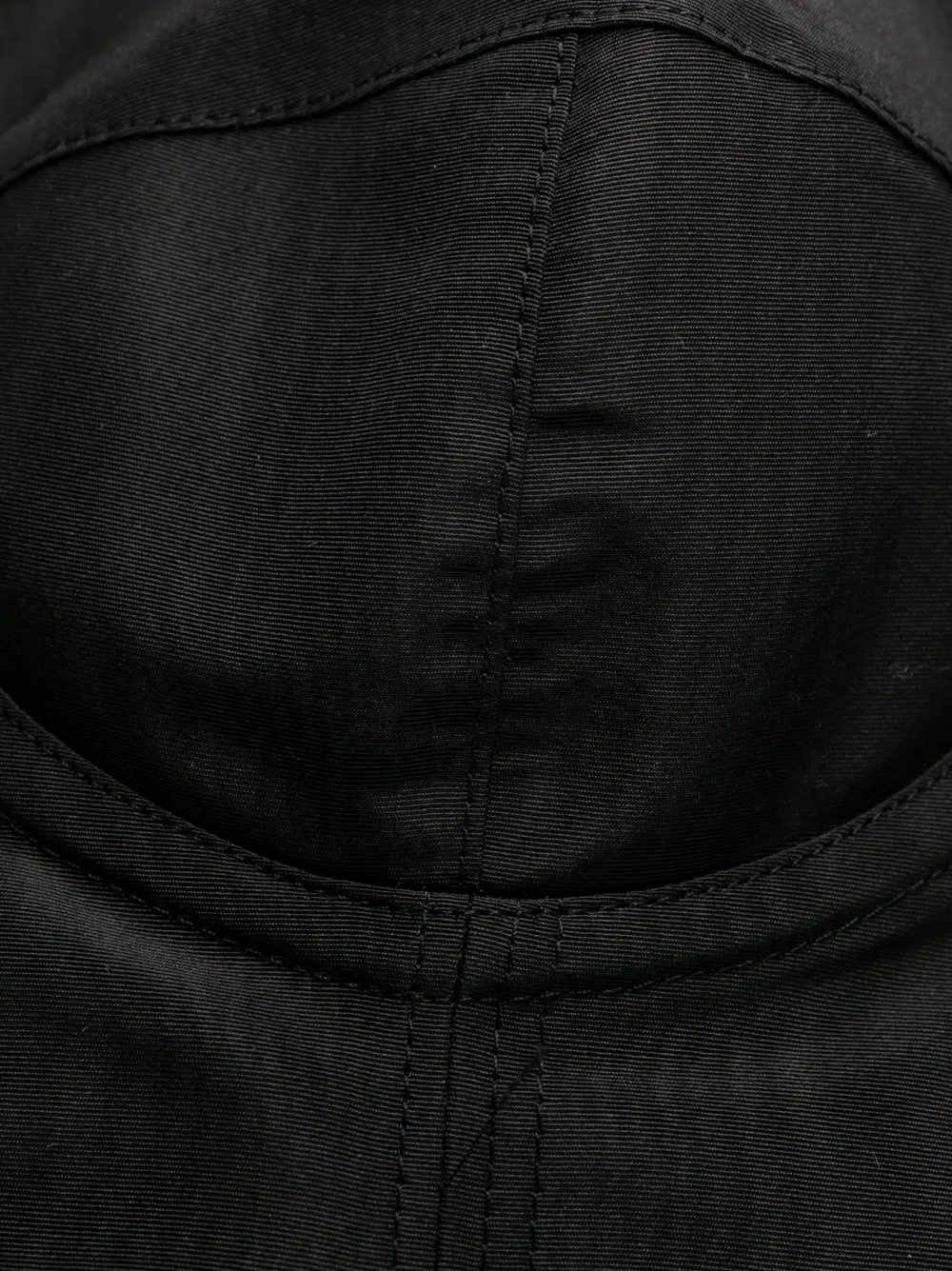Черный, смесовый шелк, вырез в форме сердца, чашка на косточках, без бретелей, без рукавов, нашивка с логотипом сбоку, застежка на крючок сзади и длина до бедер.