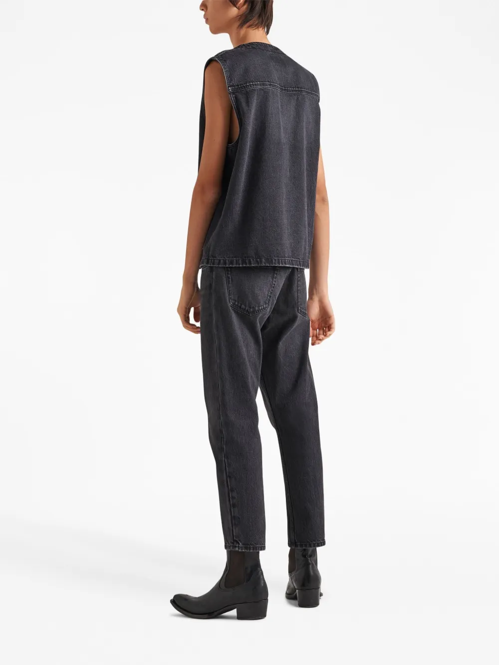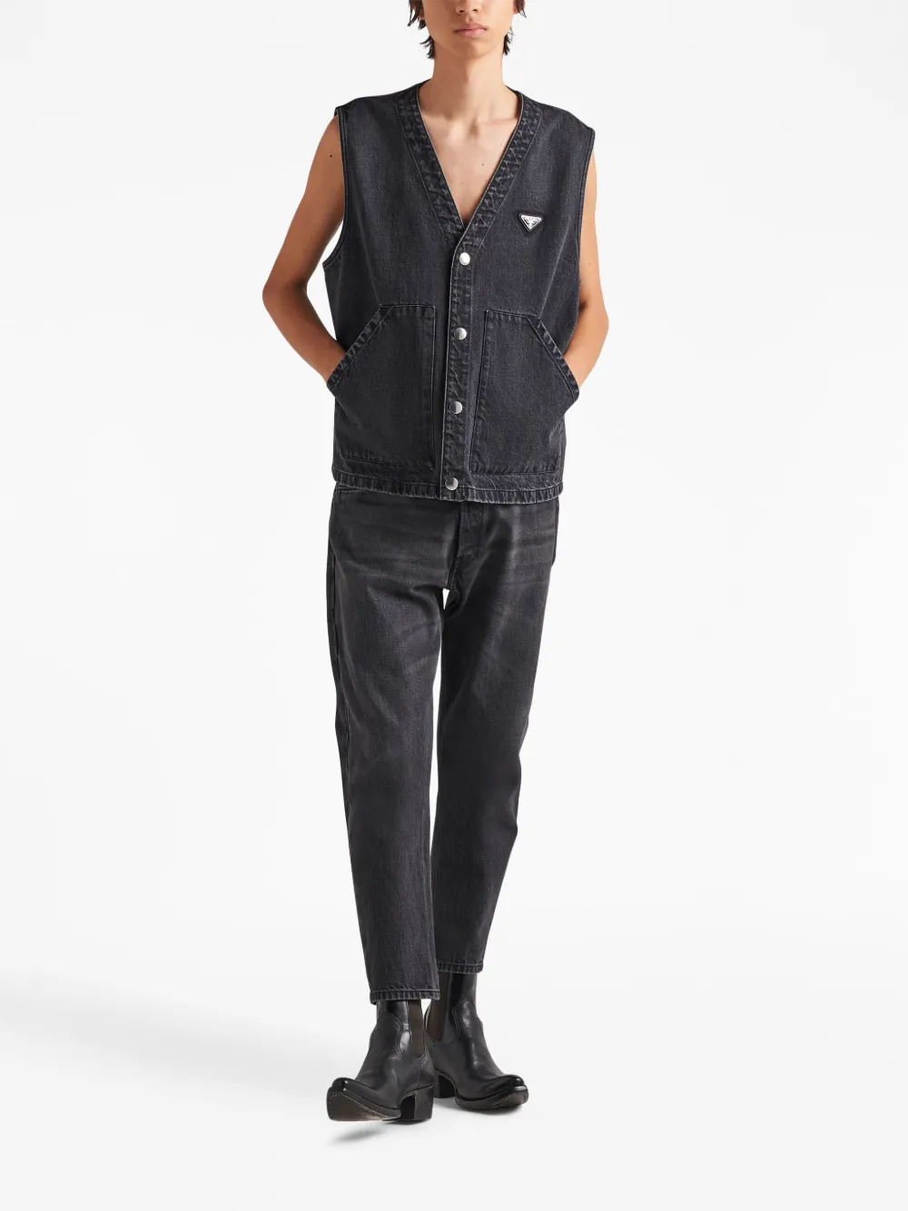 Черный, хлопок, обработанный деним, декоративные складки на бедрах, треугольный эмалированный логотип, нашивка с логотипом сзади, петли для ремня, застежка на пуговицах спереди, пять карманов, прямой крой и высота по щиколотку.