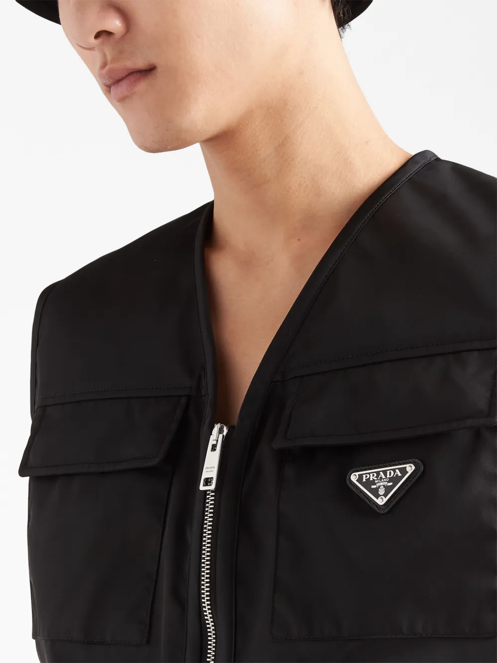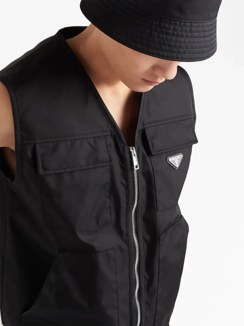 Черный, переработанный нейлон, треугольный логотип, V-образный вырез, застежка на молнии спереди, два нагрудных кармана с клапанами, без рукавов и прямой подол. Узнать больше о том, какие товары получают отметку «Ответственный выбор», можно здесь.
