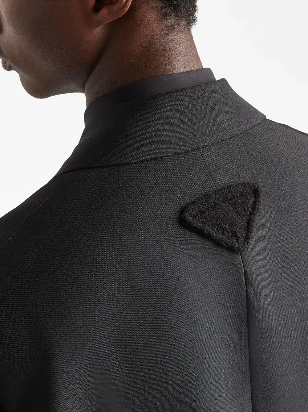 Черный, шерсть, треугольный логотип, зазубренные лацканы, застежка на пуговицах спереди, два кармана с клапанами по бокам, длинные рукава и прямой подол.