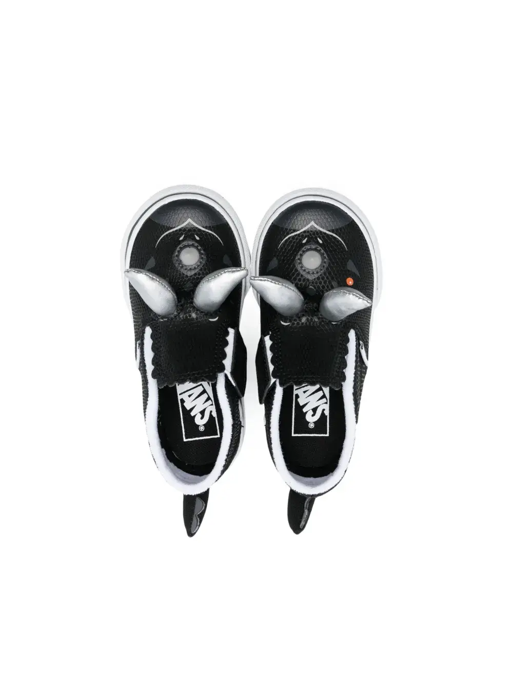 Черный, парусина, графичный принт спереди, аппликация, фактурная отделка, эластичные боковые вставки, закругленный носок, застежка на липучке, модель без застежки, петля для подтягивания сзади, стелька с логотипом и вафельная подошва.