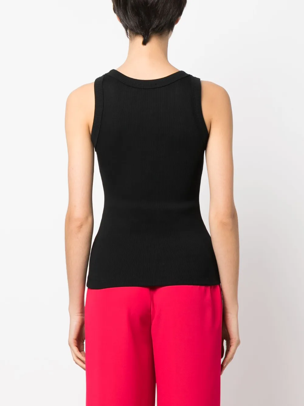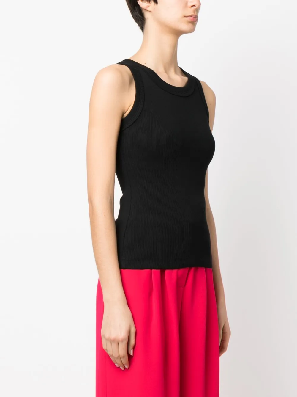 Черный, стрейчевый органический хлопок, трикотаж в рубчик, круглый вырез и без рукавов. Узнать больше о том, какие товары получают отметку «Ответственный выбор», можно здесь.