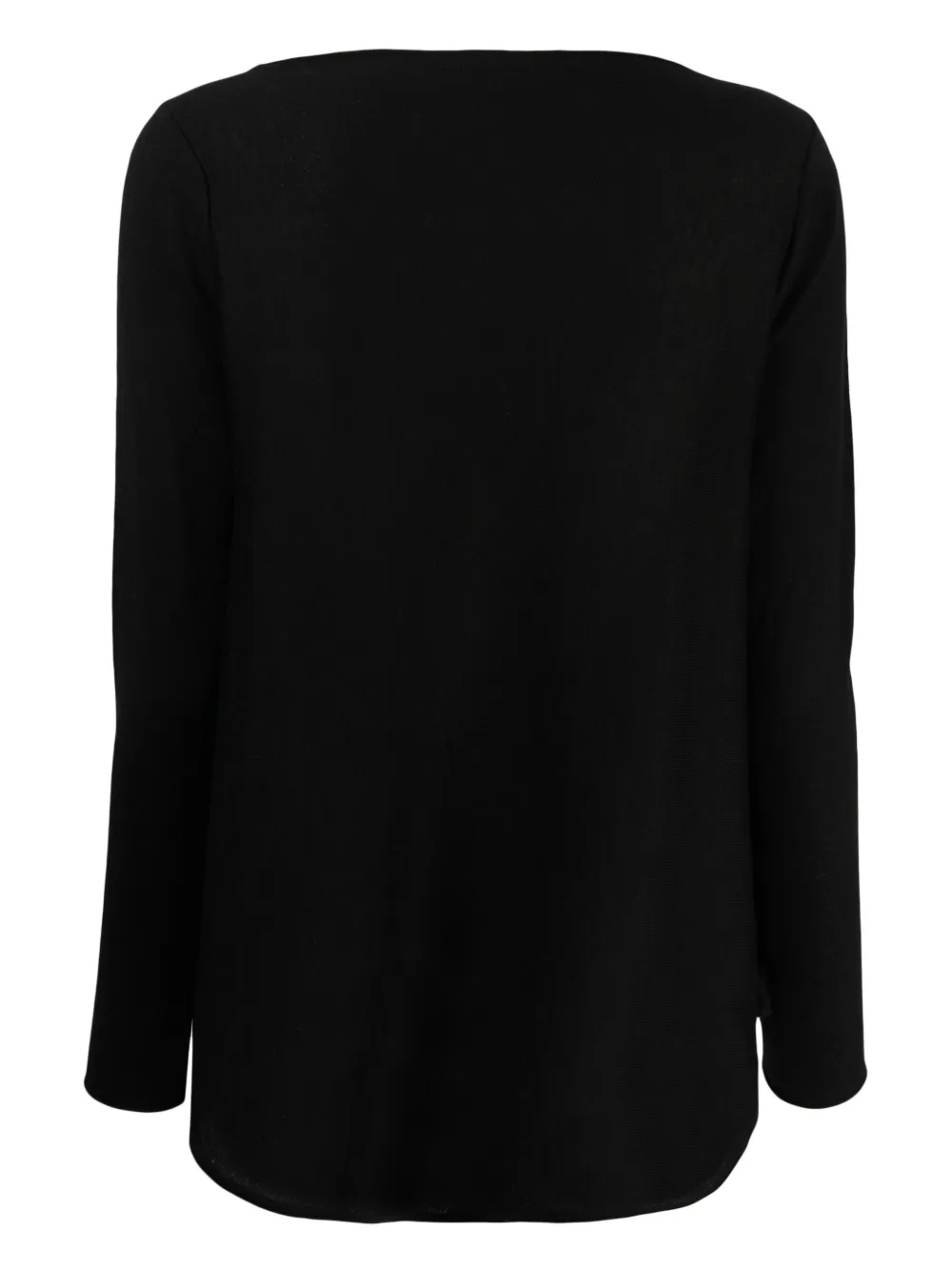 Черный, смесь кашемира и шелка, тонкая вязка, длинные рукава, круглый вырез и закругленный подол.