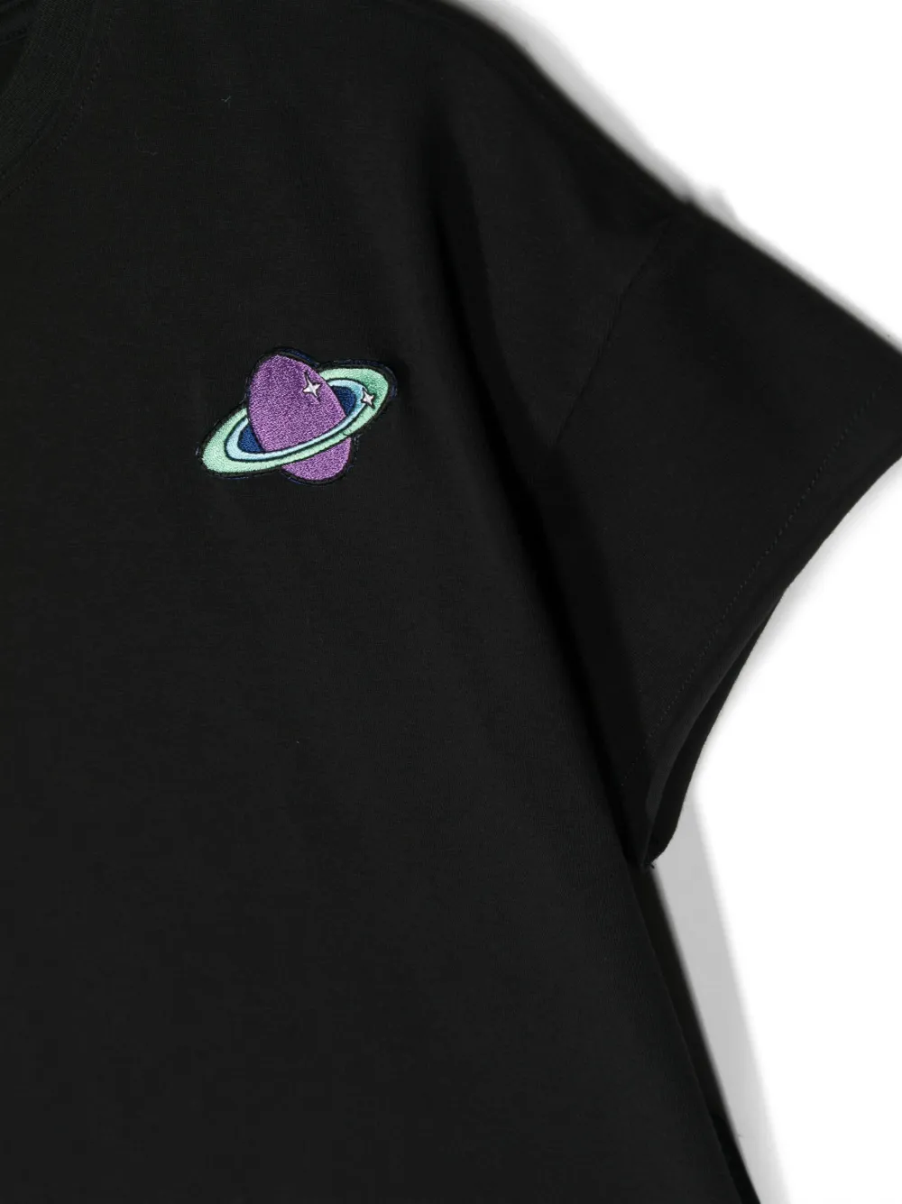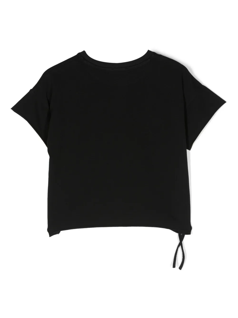 Черный, стрейчевый органический хлопок, нашивка, круглый вырез, короткие рукава, завязки по бокам и необработанный подол. Узнать больше о том, какие товары получают отметку «Ответственный выбор», можно из материала «Как мы оцениваем экологичность и этичность».
