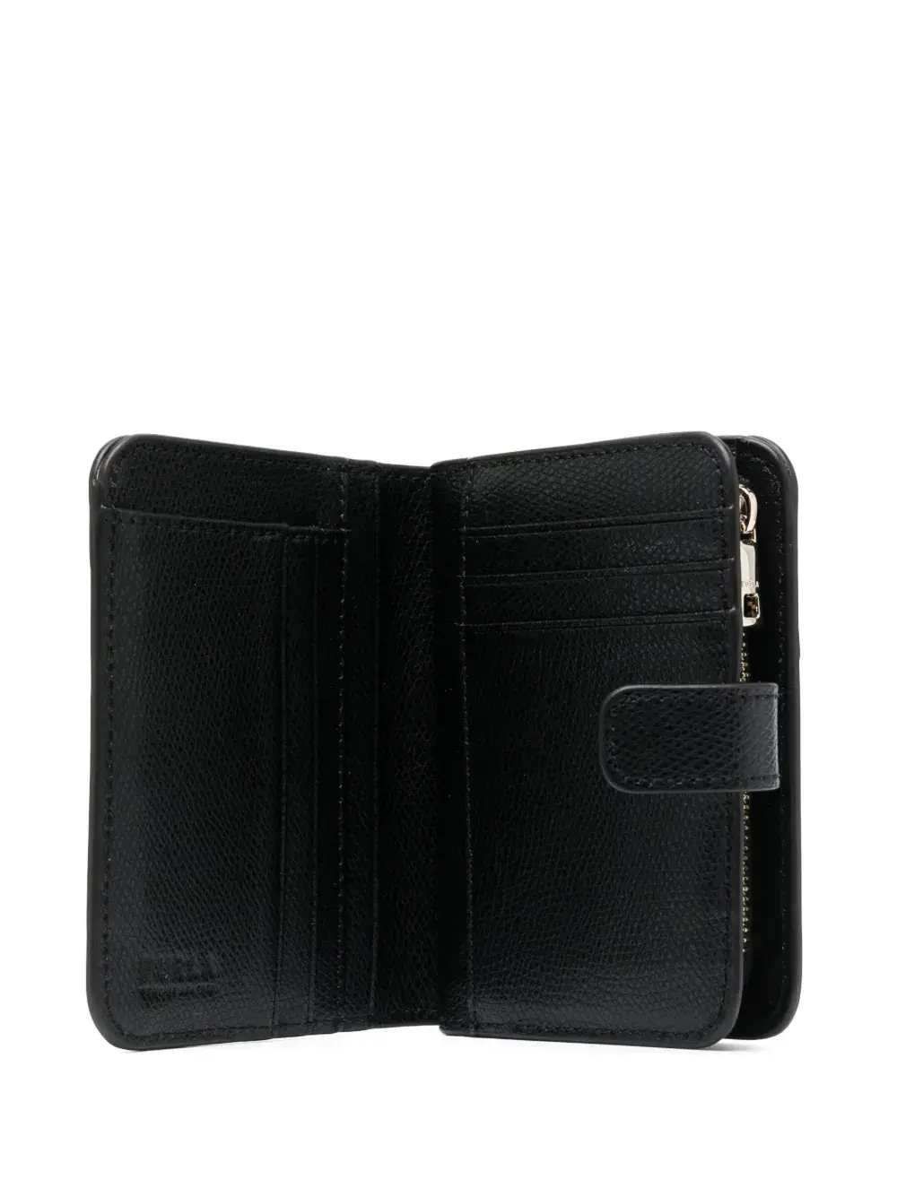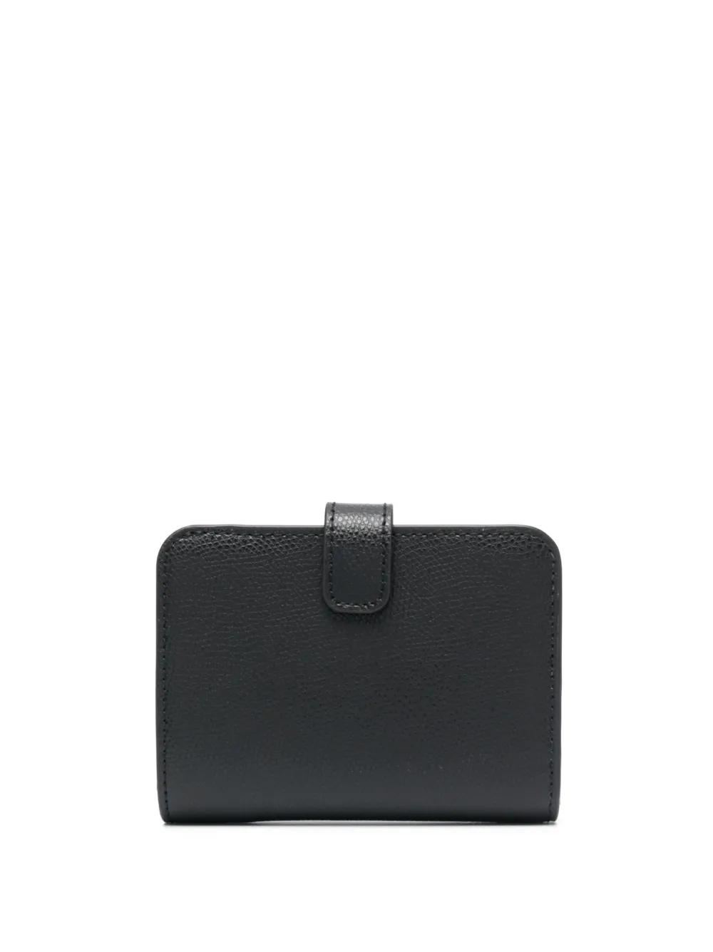 Черный, телячья кожа, зернистая текстура, золотистый логотип, декоративные складки, внутренний карман на молнии, внутренние отделения для карт и отделение для купюр.
