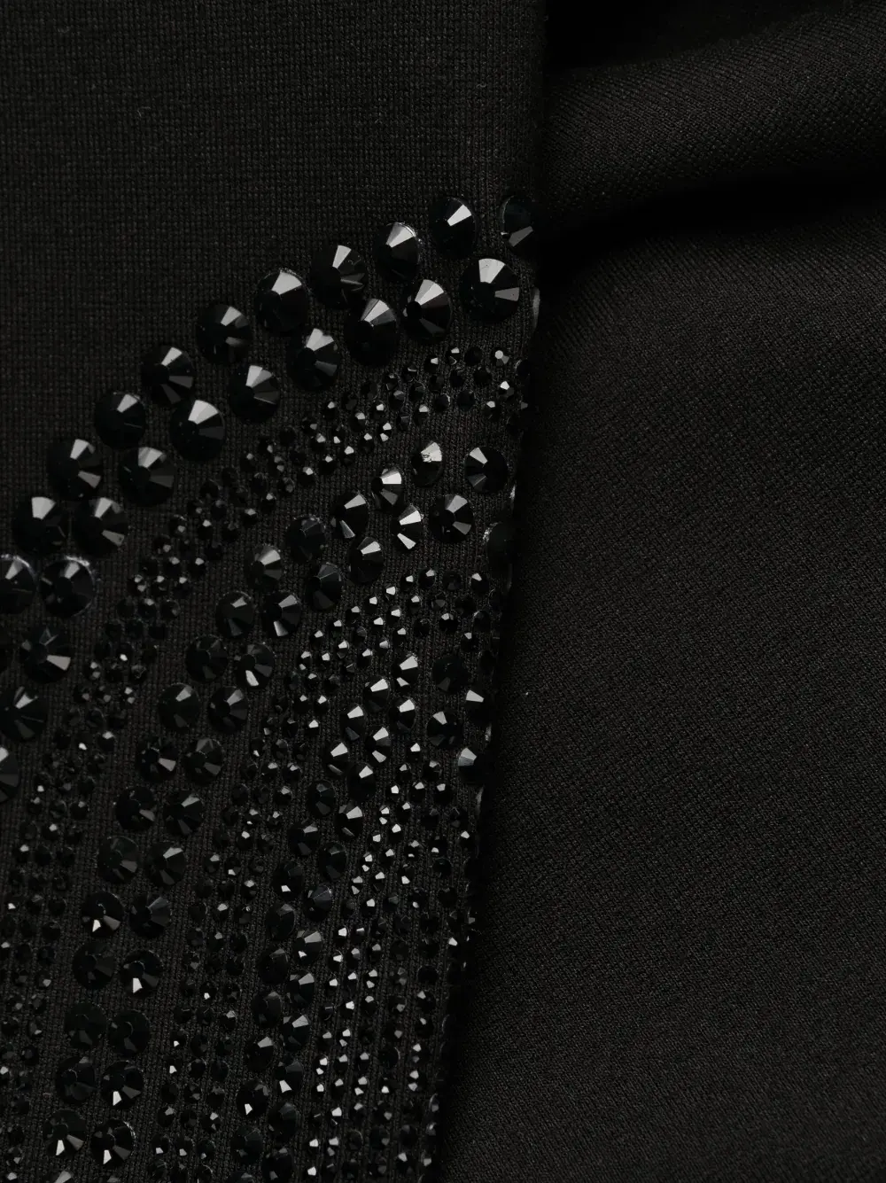 Черный, стрейчевая ткань, украшения из горного хрусталя, отделка в рубчик на коленях, завышенная талия и узкий облегающий крой.