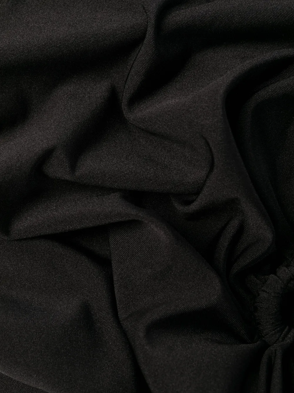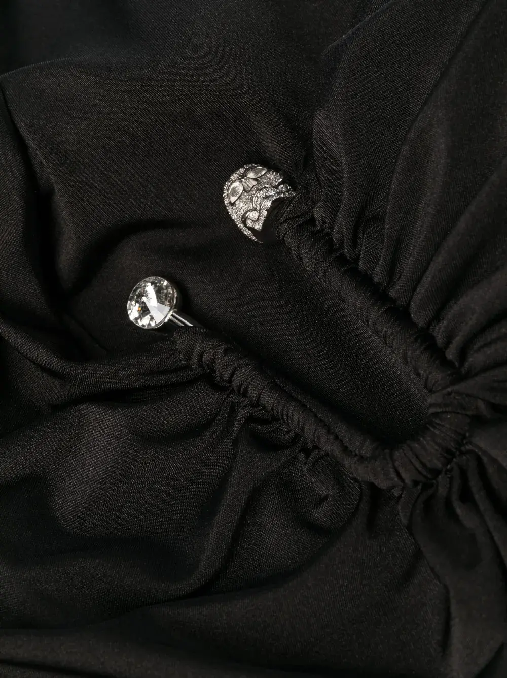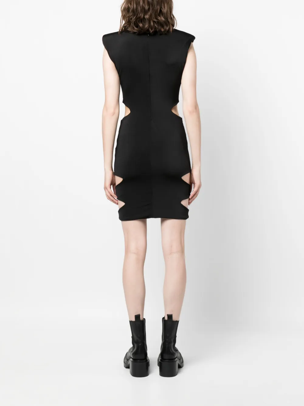 Черный, эластичный материал, декор из кристаллов, вырезные детали, асимметричный вырез, подплечники, без рукавов, облегающий крой и длина до бедер.