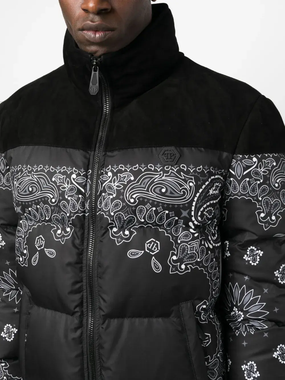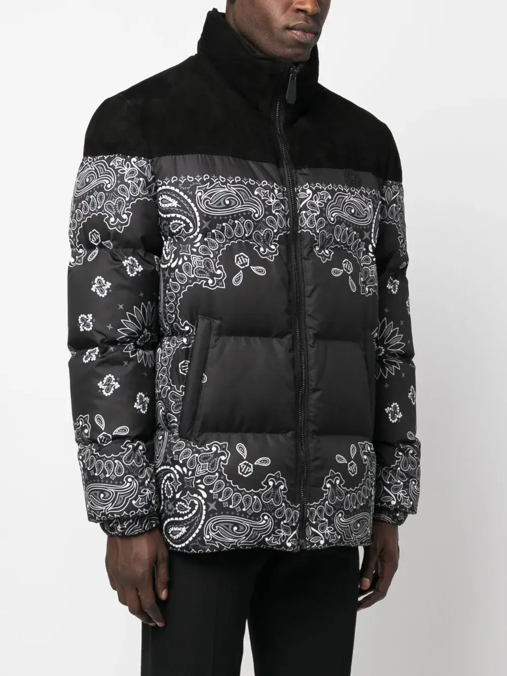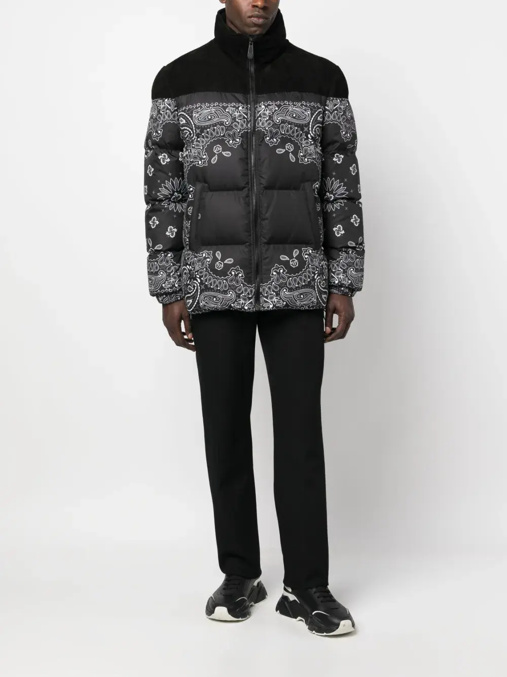 Черный/белый, принт с логотипом сзади, узор пейсли, дутый материал, замшевые вставки, высокий воротник, застежка на молнии спереди, длинные рукава, эластичные манжеты и два вшитых кармана по бокам.