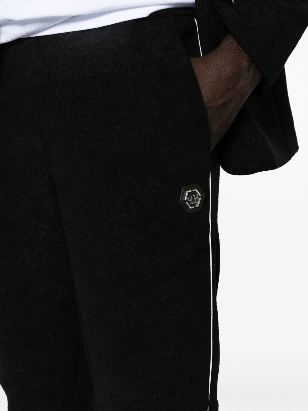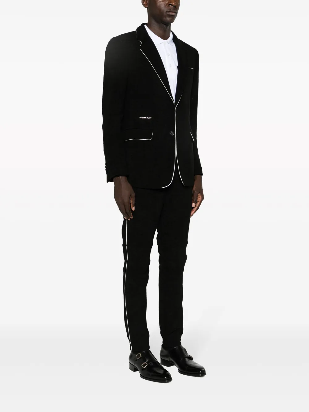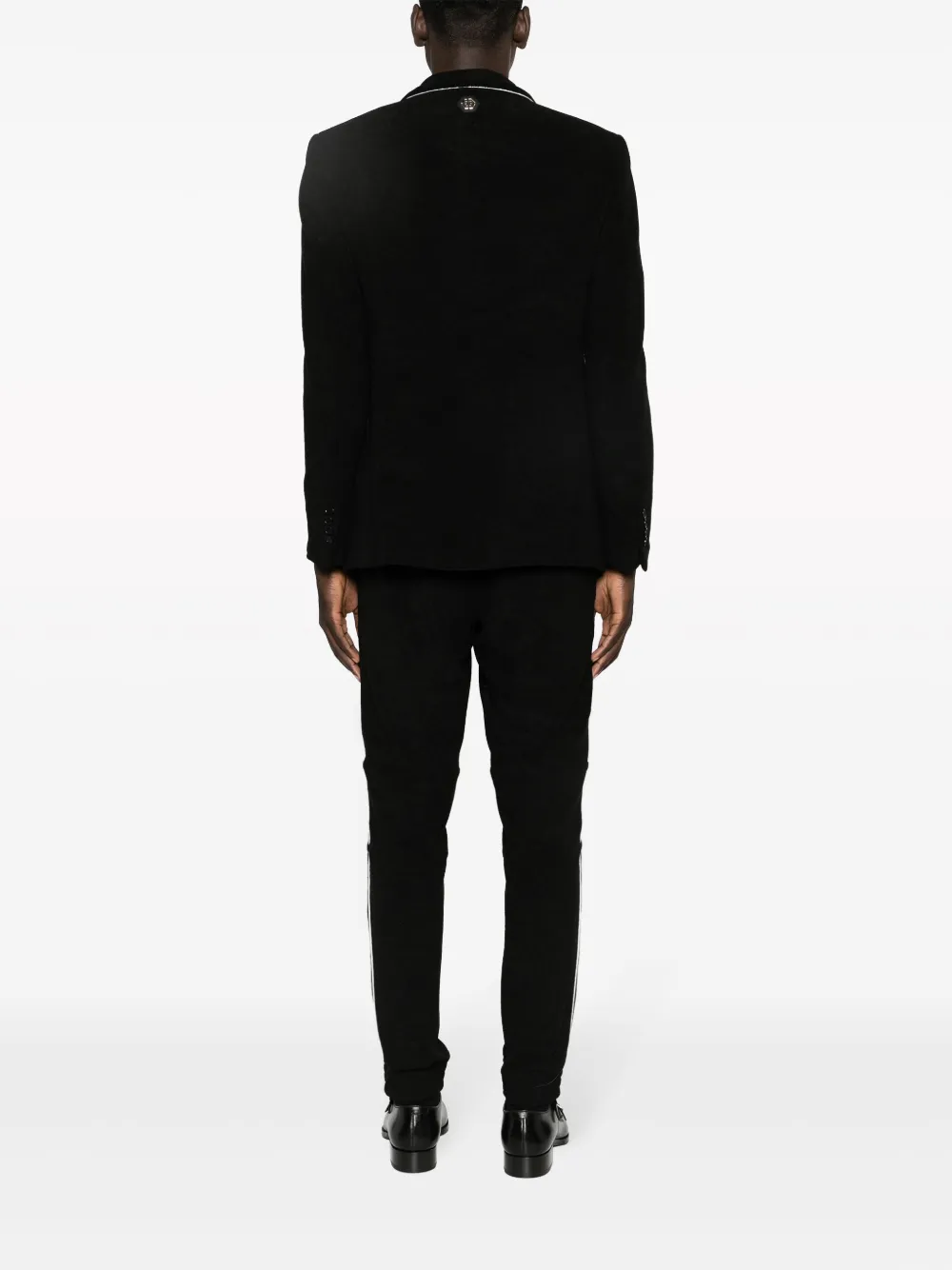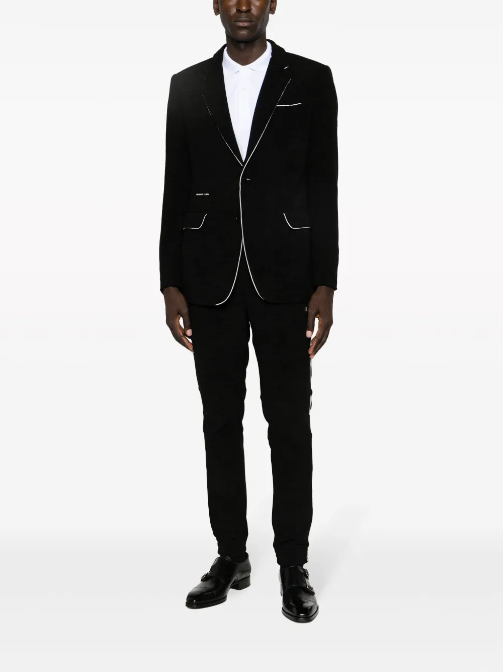 Черный/белый, бархат, материал с шениловой текстурой, объемная окантовка, серебристый логотип, нашивка с логотипом сзади, зазубренные лацканы, застежка на пуговицах спереди, длинные рукава, манжеты на пуговицах, нагрудный прорезной карман, два передних кармана с клапанами, нашивка с логотипом спереди, кулиска на талии, два вшитых кармана по бокам и два кармана с листочкой сзади.