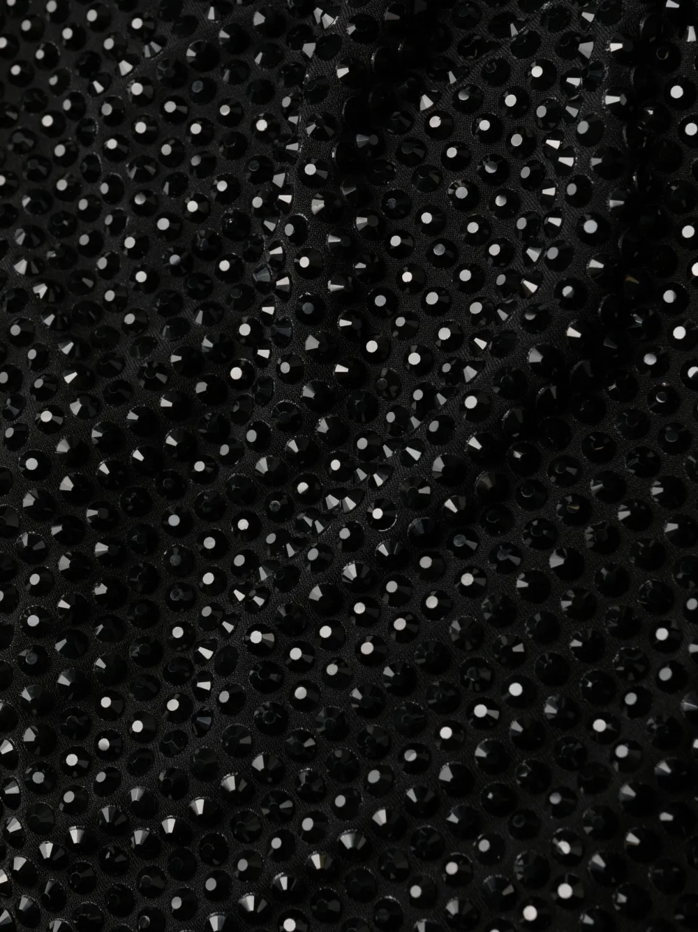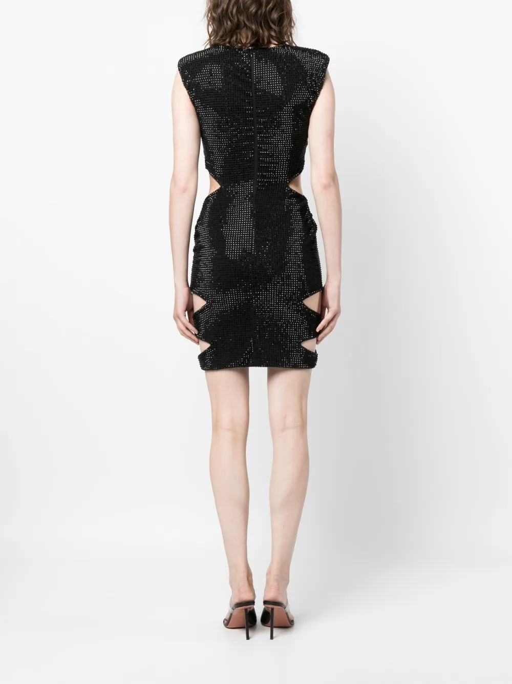 Черный, декор из кристаллов, вырезные детали, без рукавов, прямой подол и потайная застежка на молнии сзади.